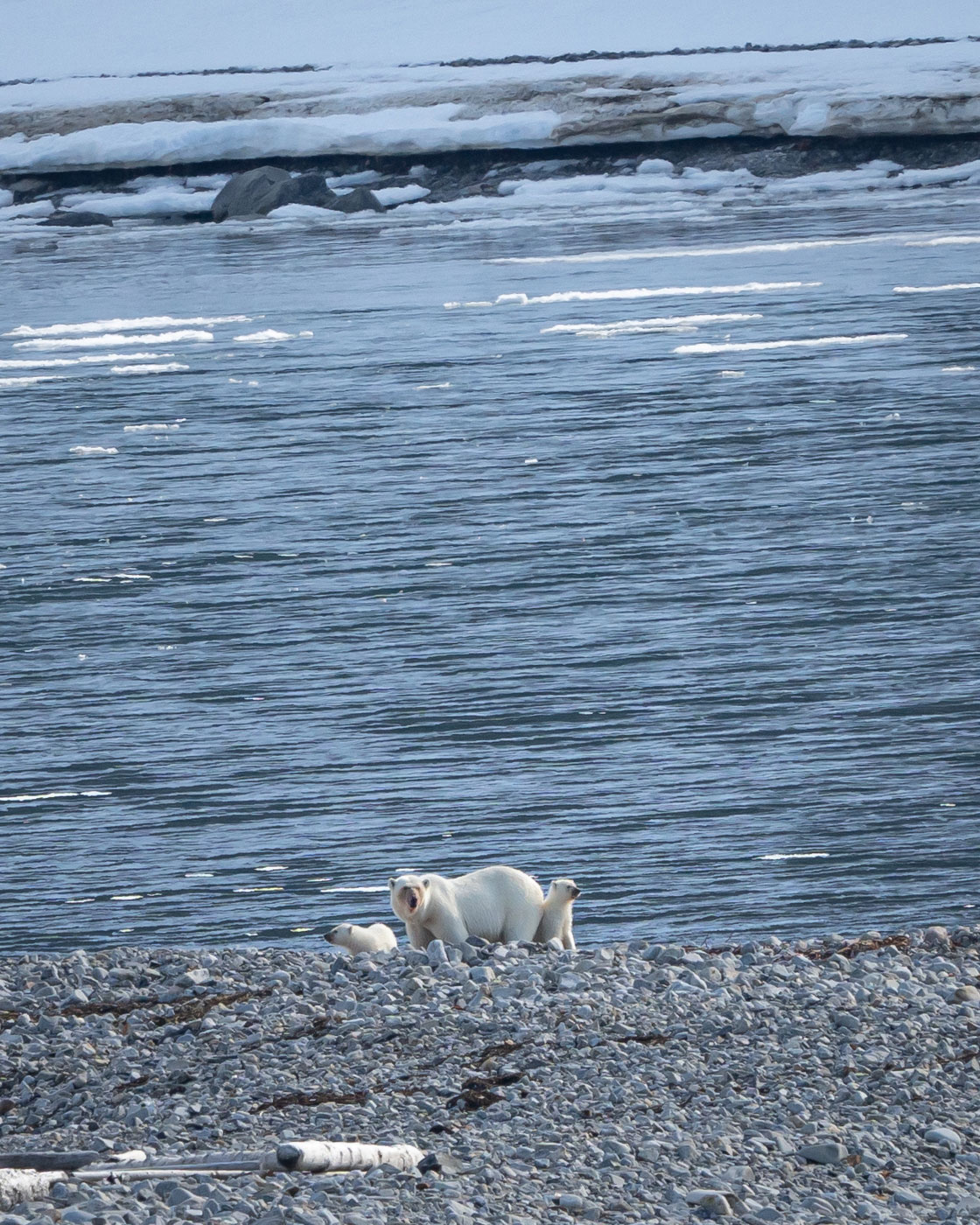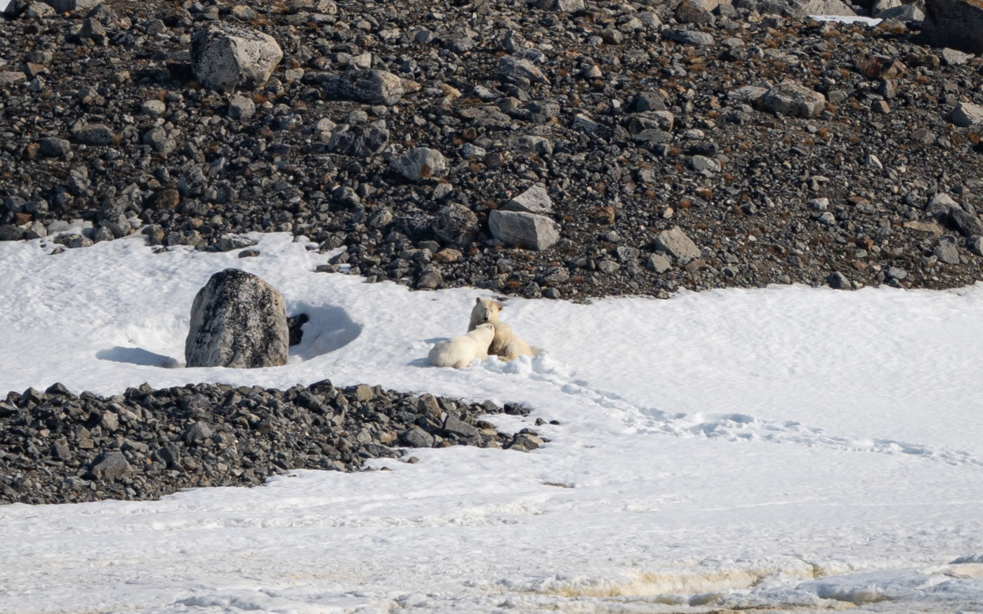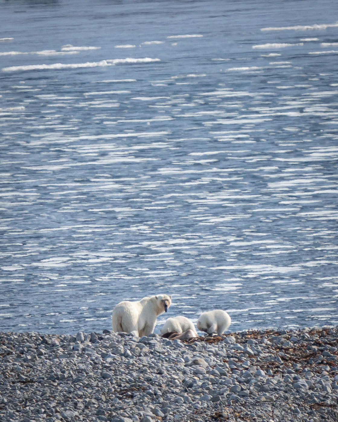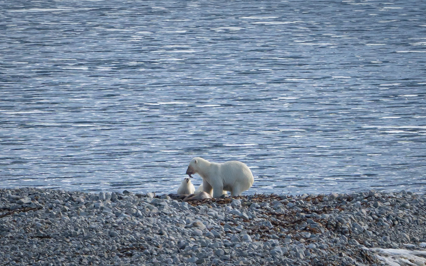 Darunter eine Mutter, die sich mit ihren beiden kleinen Baby an einem toten Walross labte. Daneben schlief ein Eisbär friedlich vor einem Stein, während weiter links ein etwas älteres Eisbärenkind an der Mutter säugte. Nach nur wenigen Tagen sahen wir bereits neun Polarbären; unfassbar.