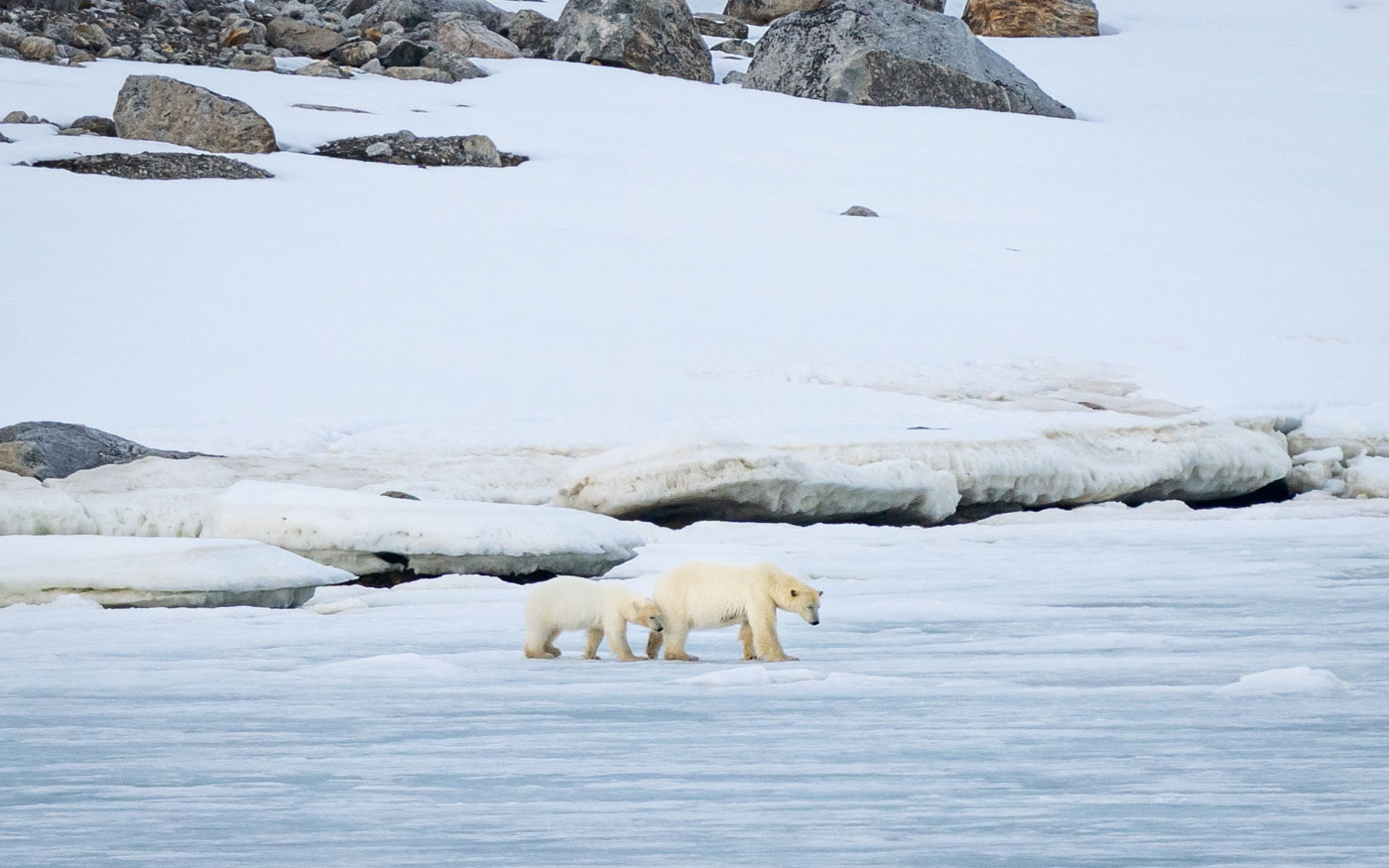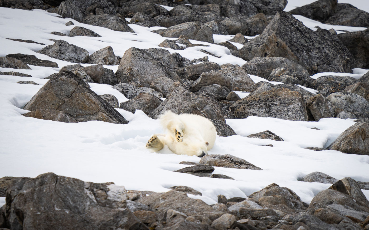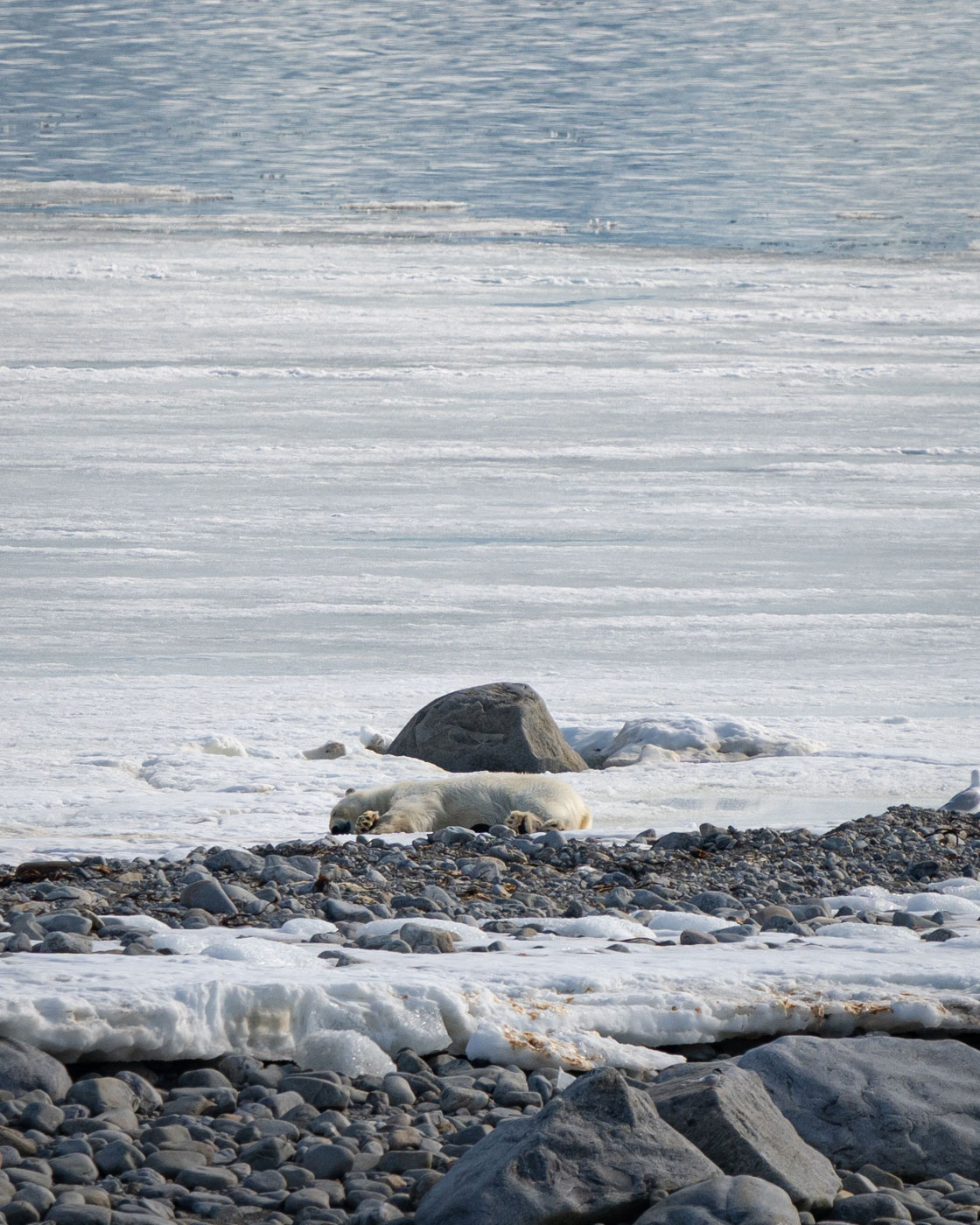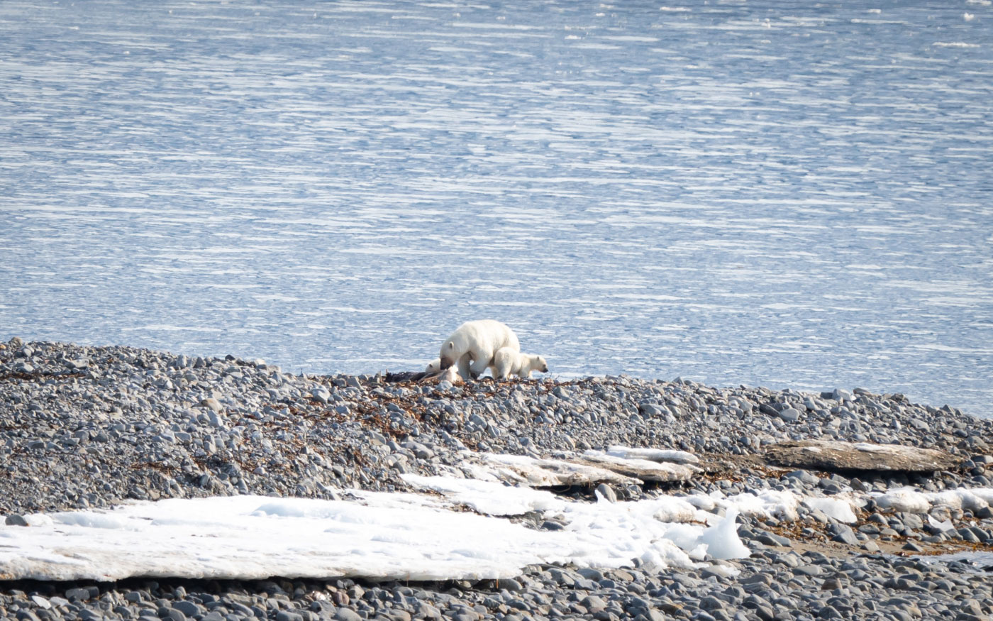 Darunter eine Mutter, die sich mit ihren beiden kleinen Baby an einem toten Walross labte. Daneben schlief ein Eisbär friedlich vor einem Stein, während weiter links ein etwas älteres Eisbärenkind an der Mutter säugte. Nach nur wenigen Tagen sahen wir bereits neun Polarbären; unfassbar.