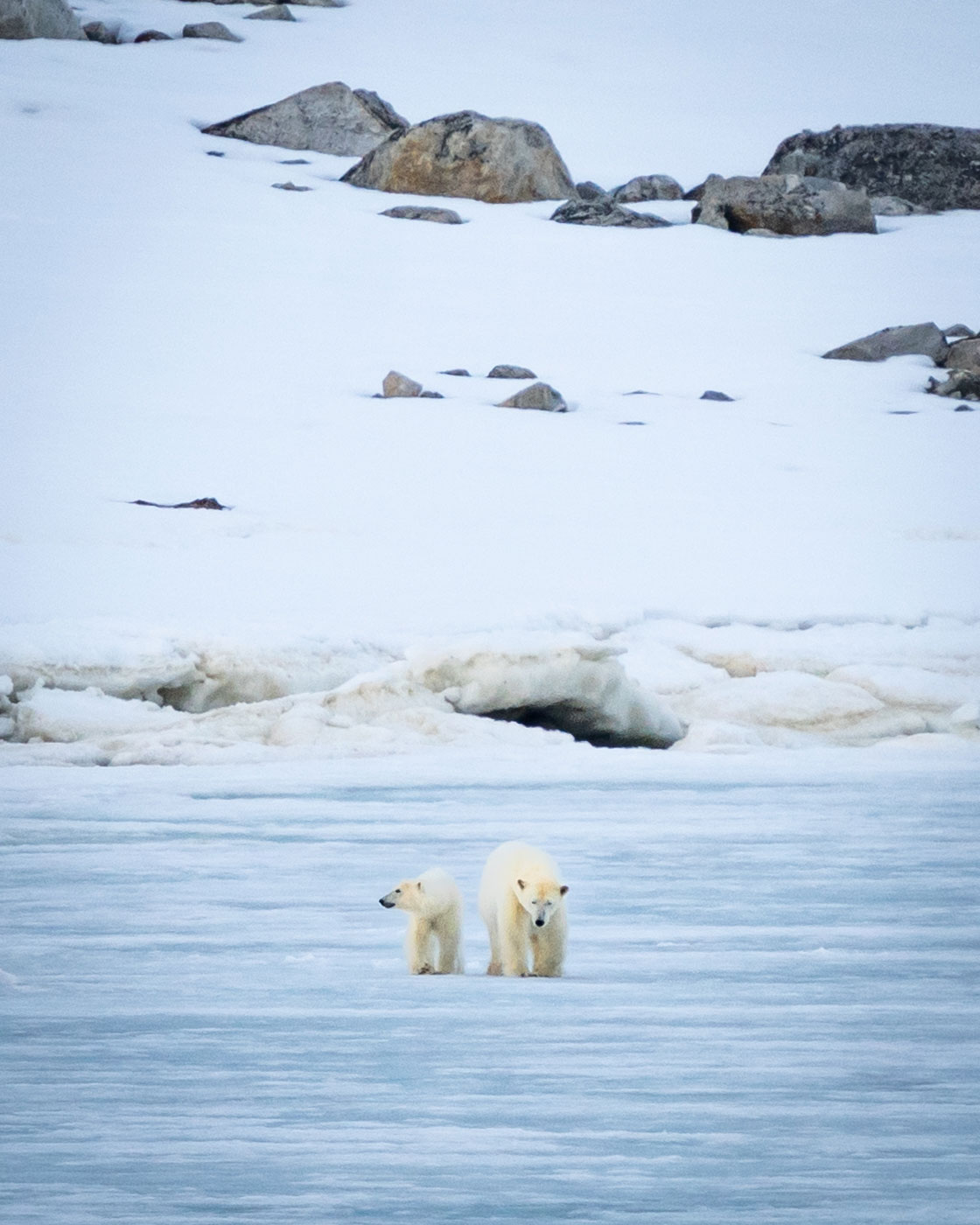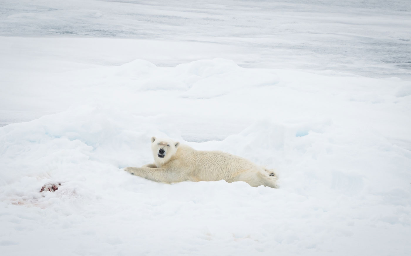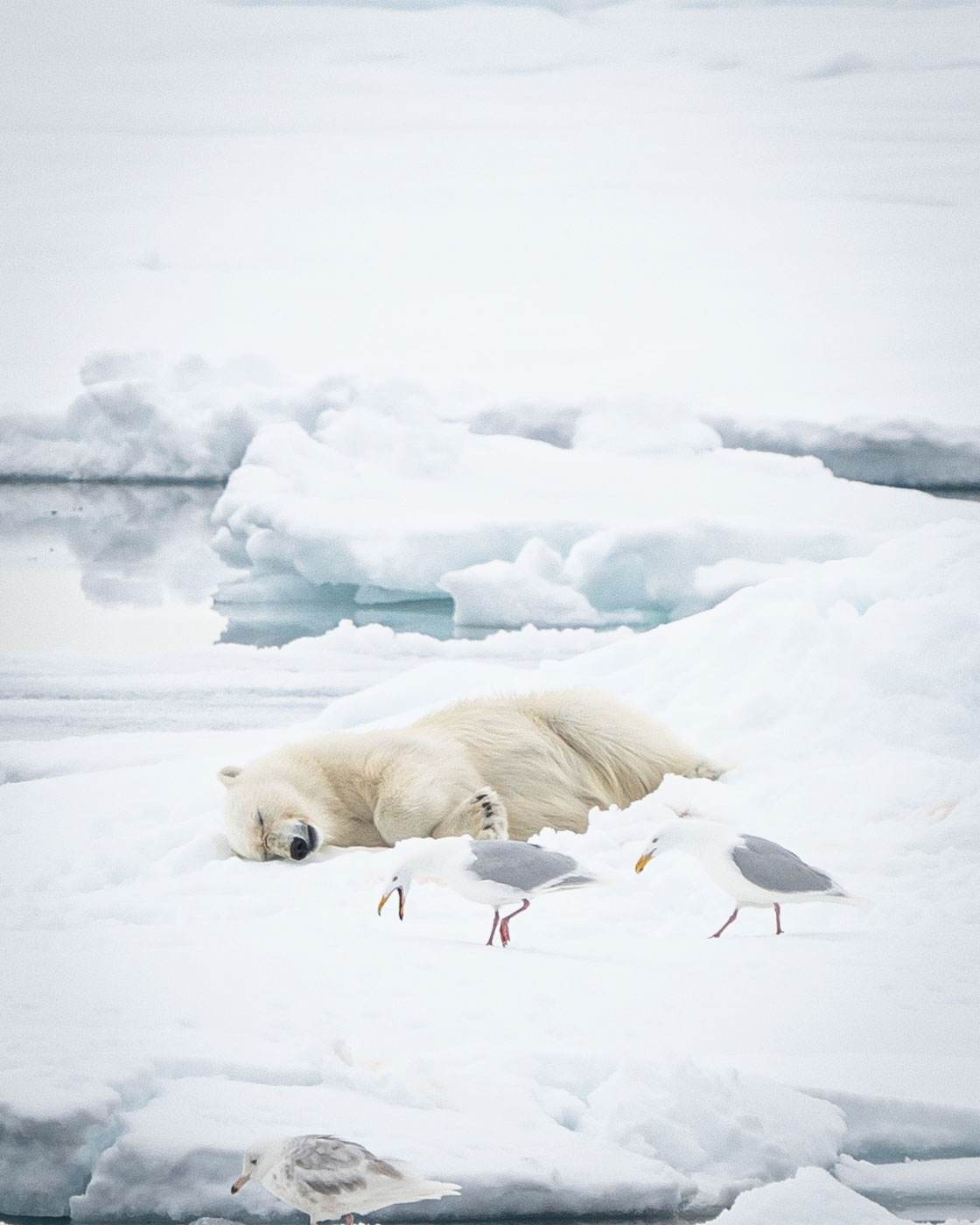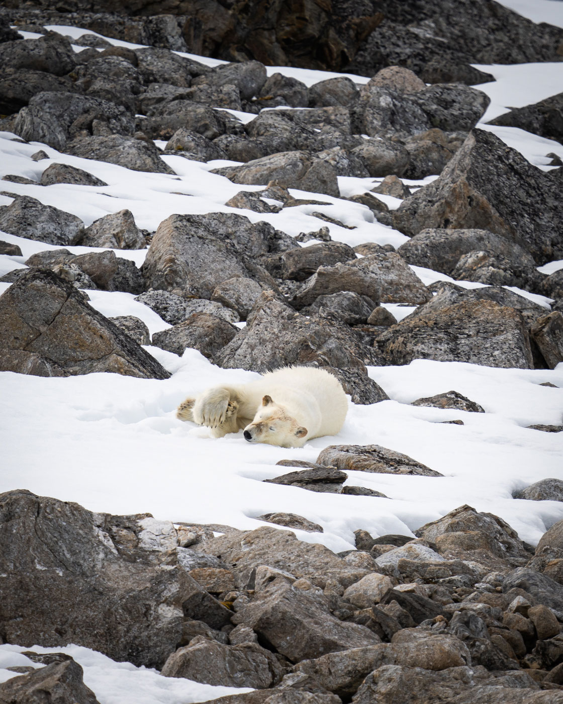 Darunter eine Mutter, die sich mit ihren beiden kleinen Baby an einem toten Walross labte. Daneben schlief ein Eisbär friedlich vor einem Stein, während weiter links ein etwas älteres Eisbärenkind an der Mutter säugte. Nach nur wenigen Tagen sahen wir bereits neun Polarbären; unfassbar.