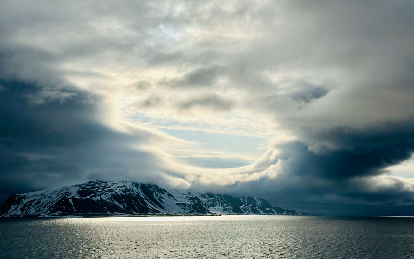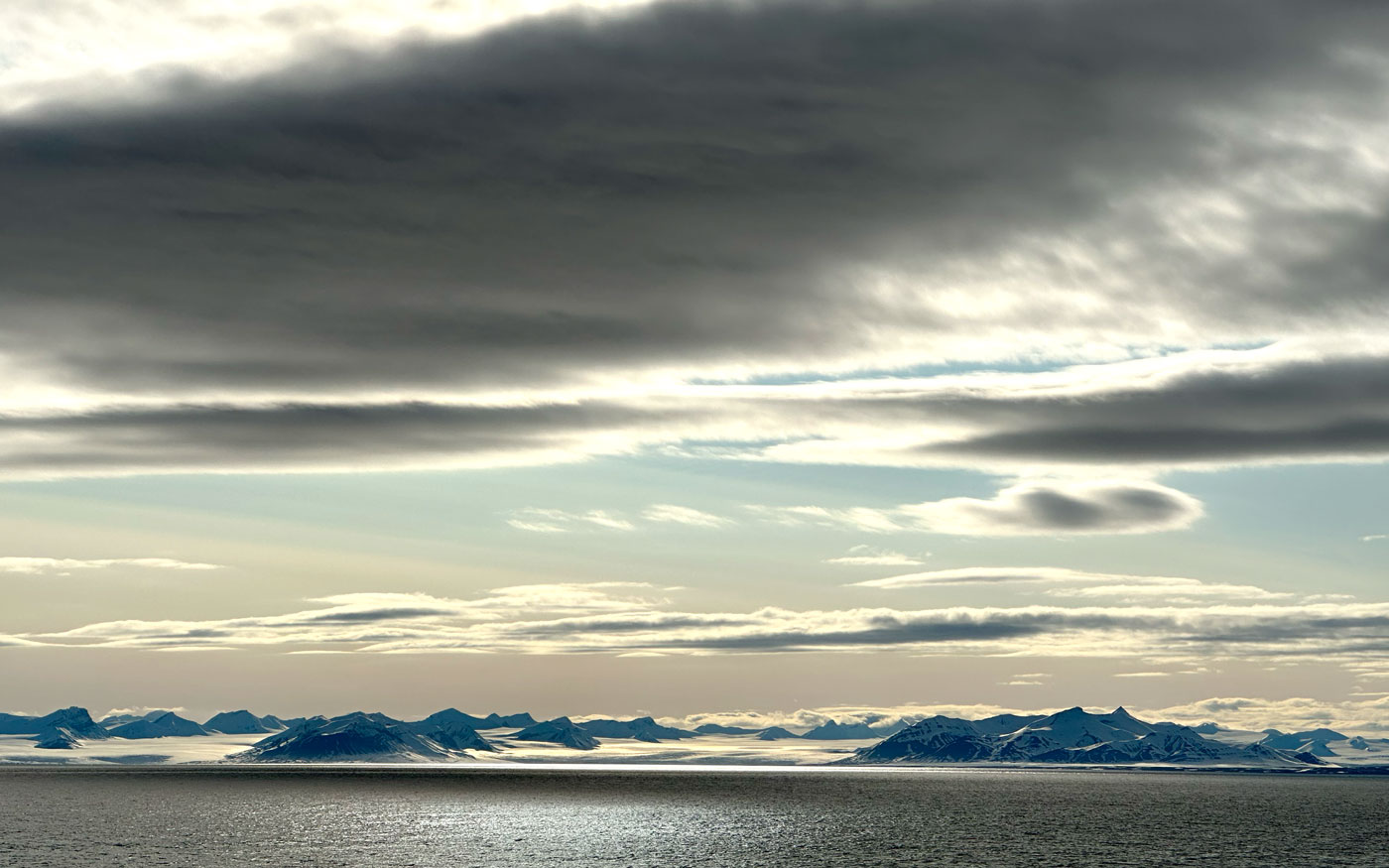 Das Schiff fuhr derweil weiter und weiter in Richtung Norden, und dunkle Wolken zogen über uns hinüber. Majestätisch schnitten die tief hängenden Regensäcke die umgebenen Eisbergspitzen wie mit einem Lineal akkurat gezeichnet ab – ein toller Anblick.