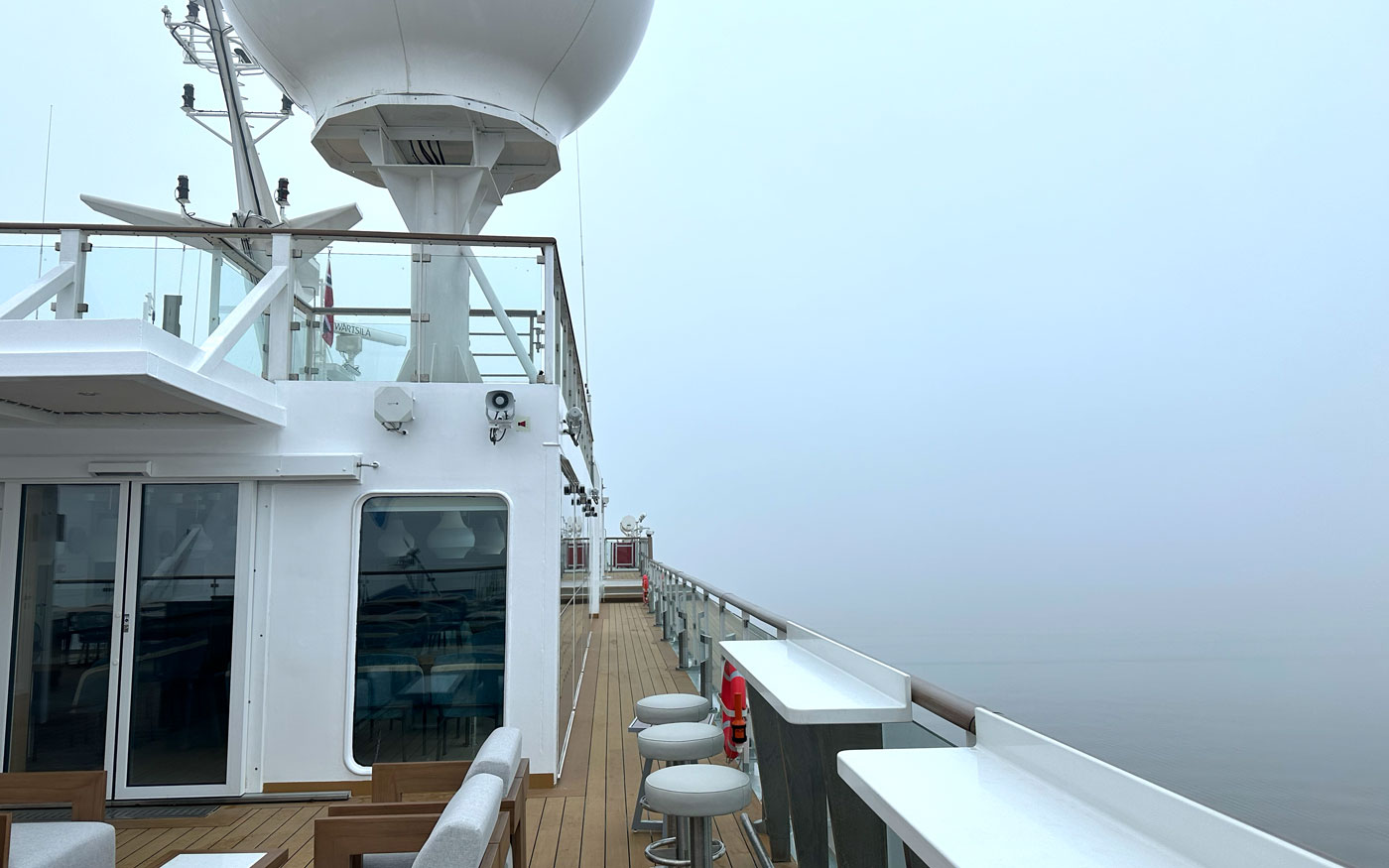 Am Morgen kam er dann, der viel zitierte Nebel; pünktlich zur Abreise, als hätte die Natur ihre Uhr danach gestellt und uns die vorherigen Tage das beste aller möglichen Wetter bescheren wollen. Mit dem Nebel kam dann auch die Kälte; es kühlte sich um gefühlte 15 Grad ab, es wurde an Deck sehr ungemütlich. Wir wollten uns nicht vorstellen, was gewesen wäre, wenn wir dieses Wetter über die gesamte Woche gehabt hätten.