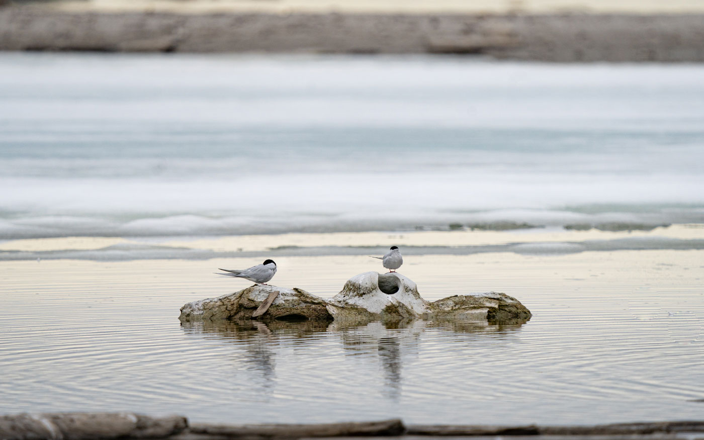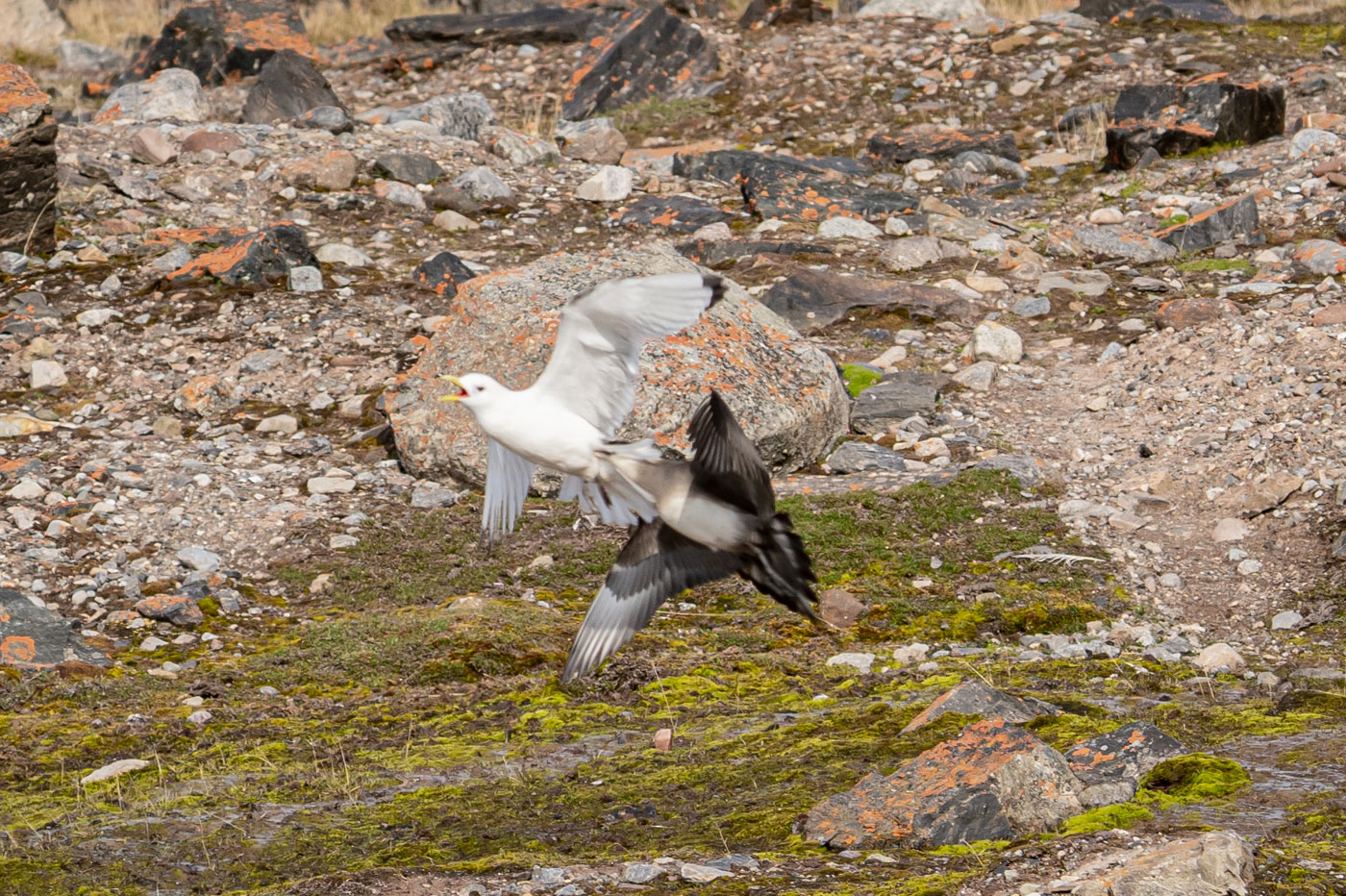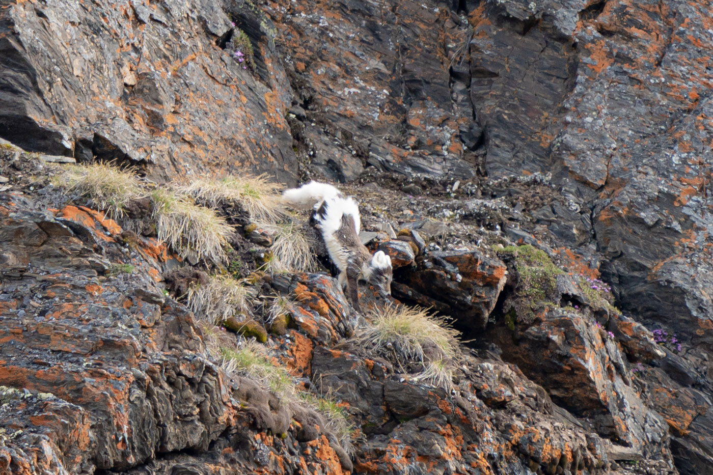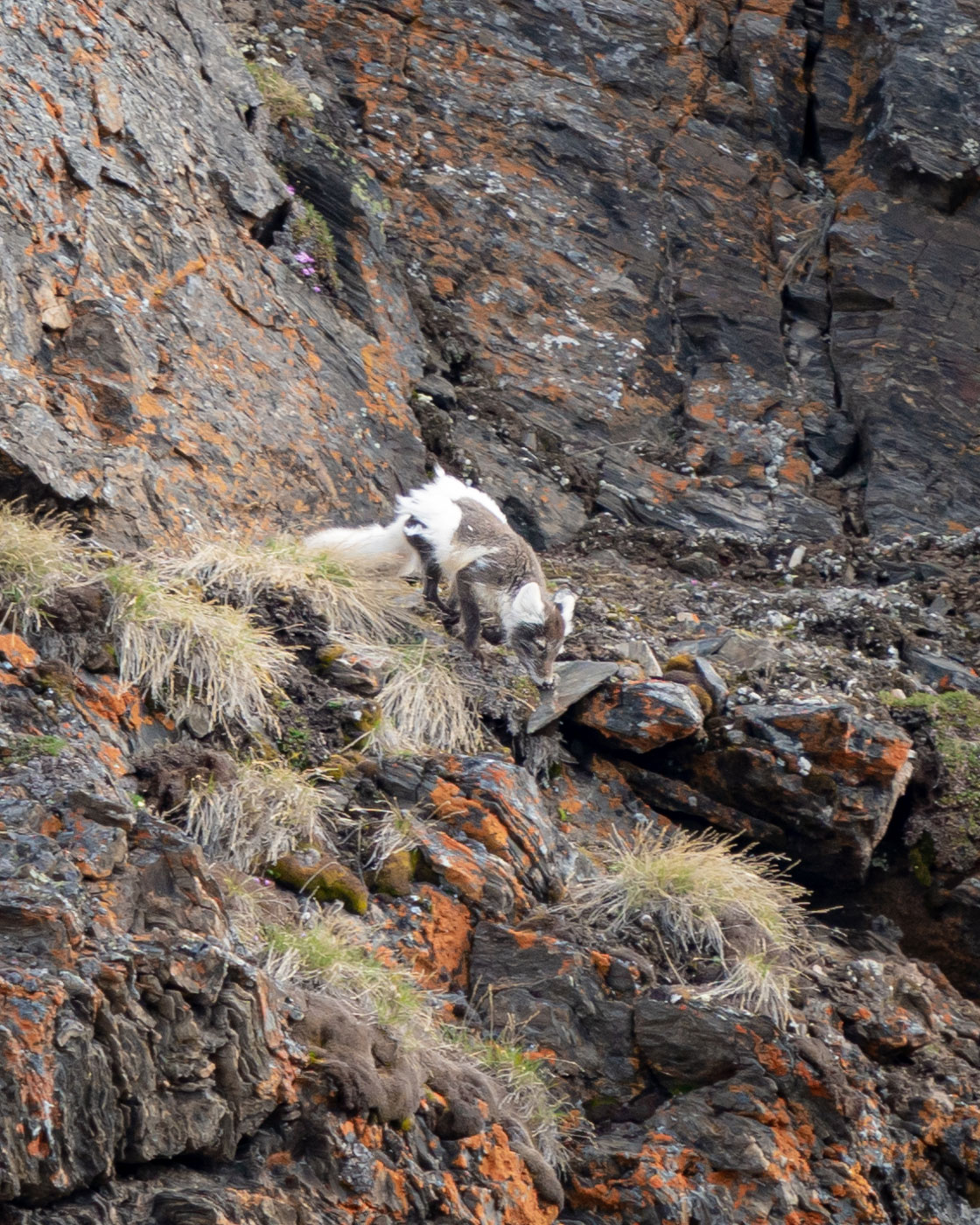 Das zog wiederum den kleinen, süßen arktischen Fuchs an, der zu dieser Jahreszeit nicht schneeweiß, sondern im Fellwechselmodus ist. Der versucht nämlich, an die Eier der Möwen zu kommen.