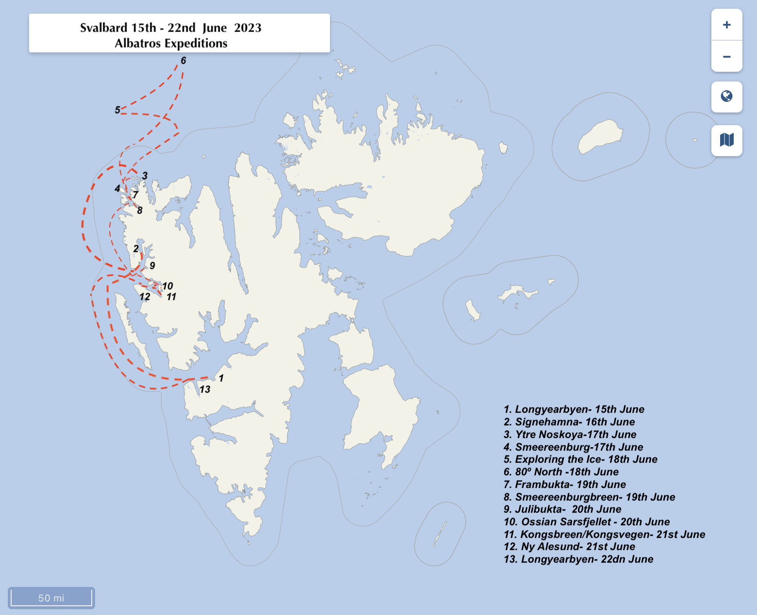 Hier die endgültige Route unserer Reise. Da man die Wetter- und Packeisverhältnisse nur sehr kurzfristig einschätzen kann, gibt es vorab kein festgelegtes "Programm"; das wird jeden Abend beim Recap und Briefing besprochen.
