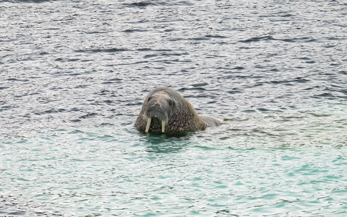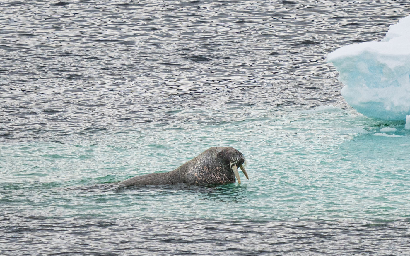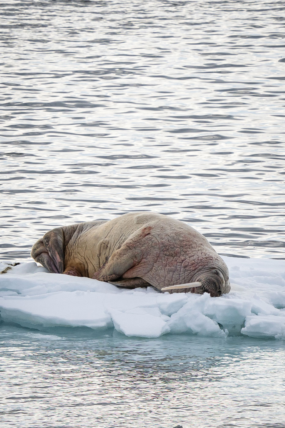 Pünktlich mit meinem Weckerklingeln um 6:30 Uhr ertönte prompt die erste Durchsage: In etwa 100 Metern Entfernung wurde ein einsam daher schlafendes Walross auf einer Eisscholle gesichtet.