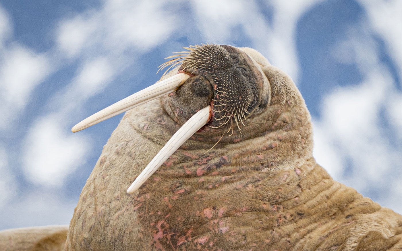 Diese machten sich schnurstracks auf den Weg zu den Walross-Resten, an denen zuvor die beiden Babys mit ihrer Mutter knabberten. Wir beobachteten das Treiben für etwa eine Stunde, während die Wolkenfetzen hinter uns ein surreales Himmelsbild formierten.