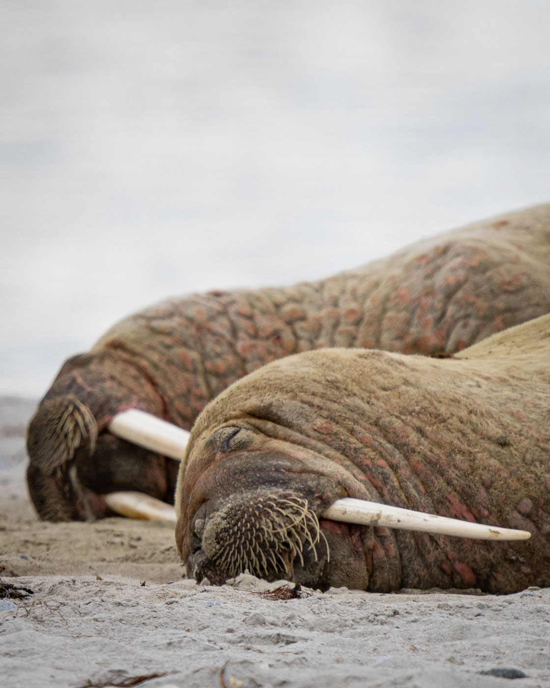 Als der Walfang dann aufs Meer verlagert wurde (die Bestände im Fjordwasser waren aufgebraucht), wurde diese Anlage geschlossen. Überreste aus alten Öfen, die aus dem „Blubber Cement“ (also den mehreren Zentimeter dicken Fettschichten der Wale) gebaut wurden, gab es hier genau so zu sehen wie etwa 20 daher dösende Walrosse. Absolute „Spirit Animals“.