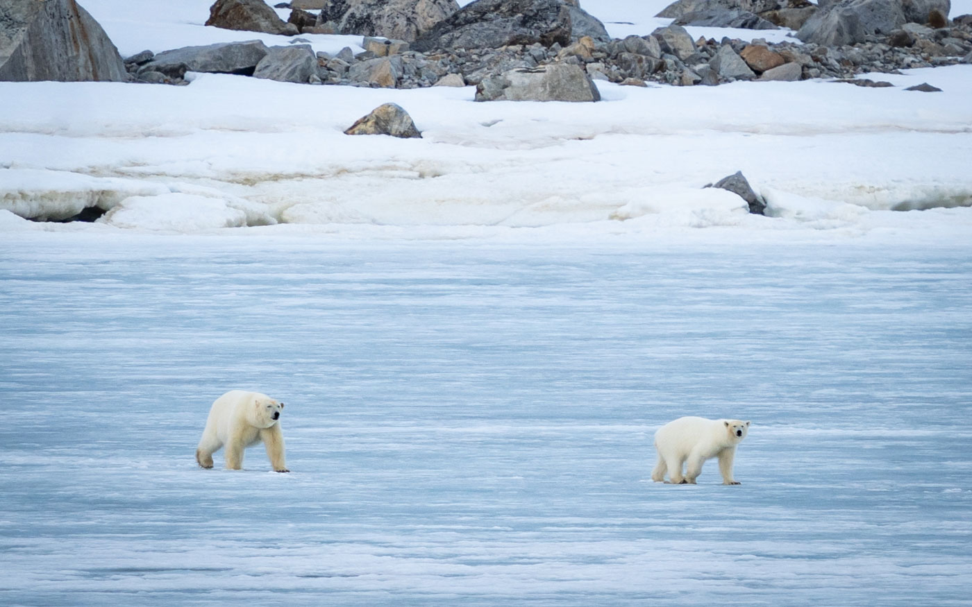 Dann gab es erneut eine Eisbären-Sichtung; unfassbar ... Wir – und damit schließe ich die erfahrene Besatzung und alle Guides mit ein – konnten unser Glück kaum fassen: Sechs (!) Eisbären machten es sich an einem kleinen Landstück gemütlich.