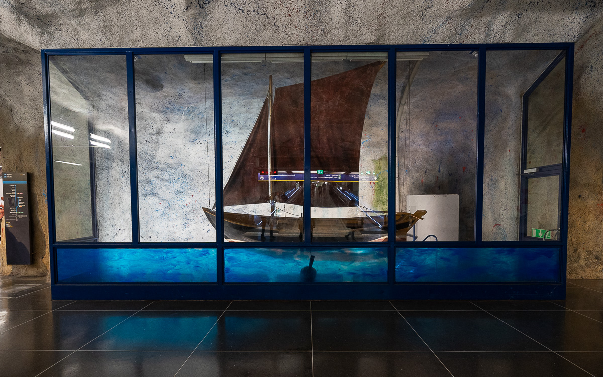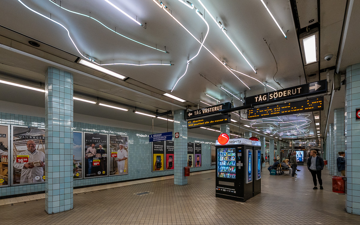 Die Kunst bei Fridhemsplan hat kein klares Thema: Es gibt ein Schiff in einer Vitrine, ein Anker und Flügel wie man sie bei ersten Versuchen zum Fliegen baute. Der Grund deines Aufenthalts ist der Umstieg von der grünen auf die blaue Linie. Es gibt durch einen 200 m langen Tunnel, der die Bahnsteige der grünen und blauen Linie verbindet.