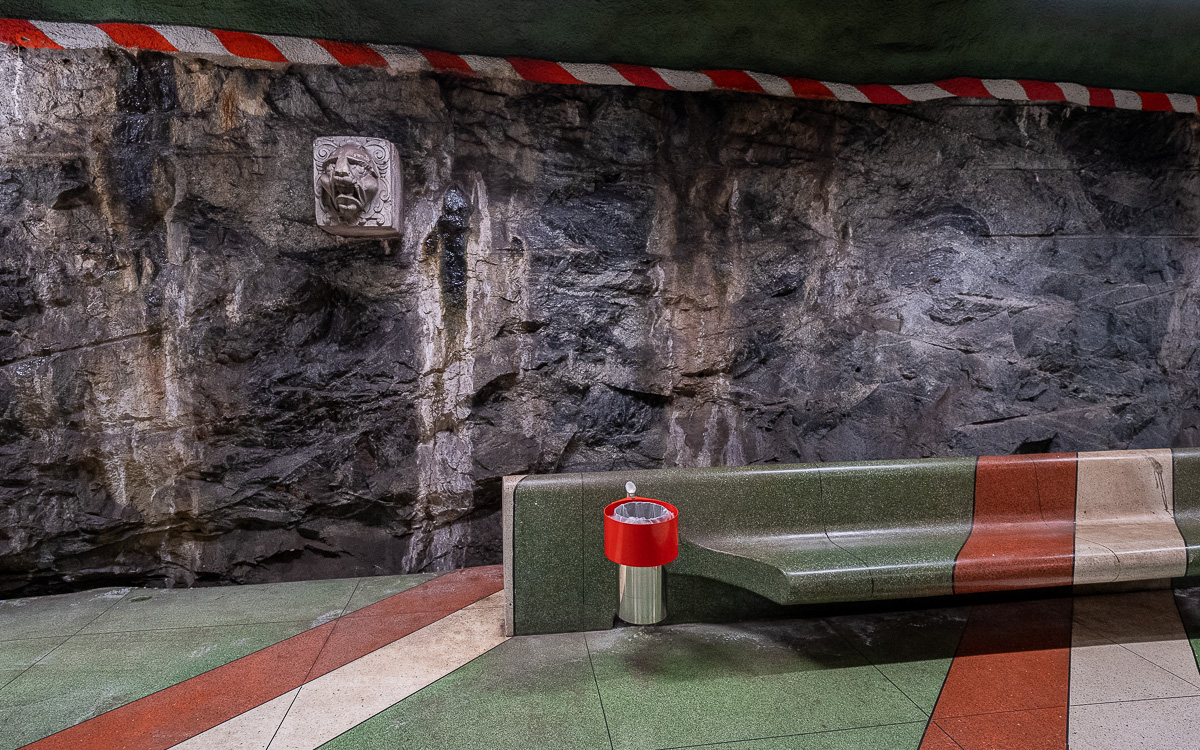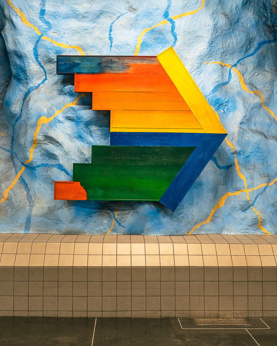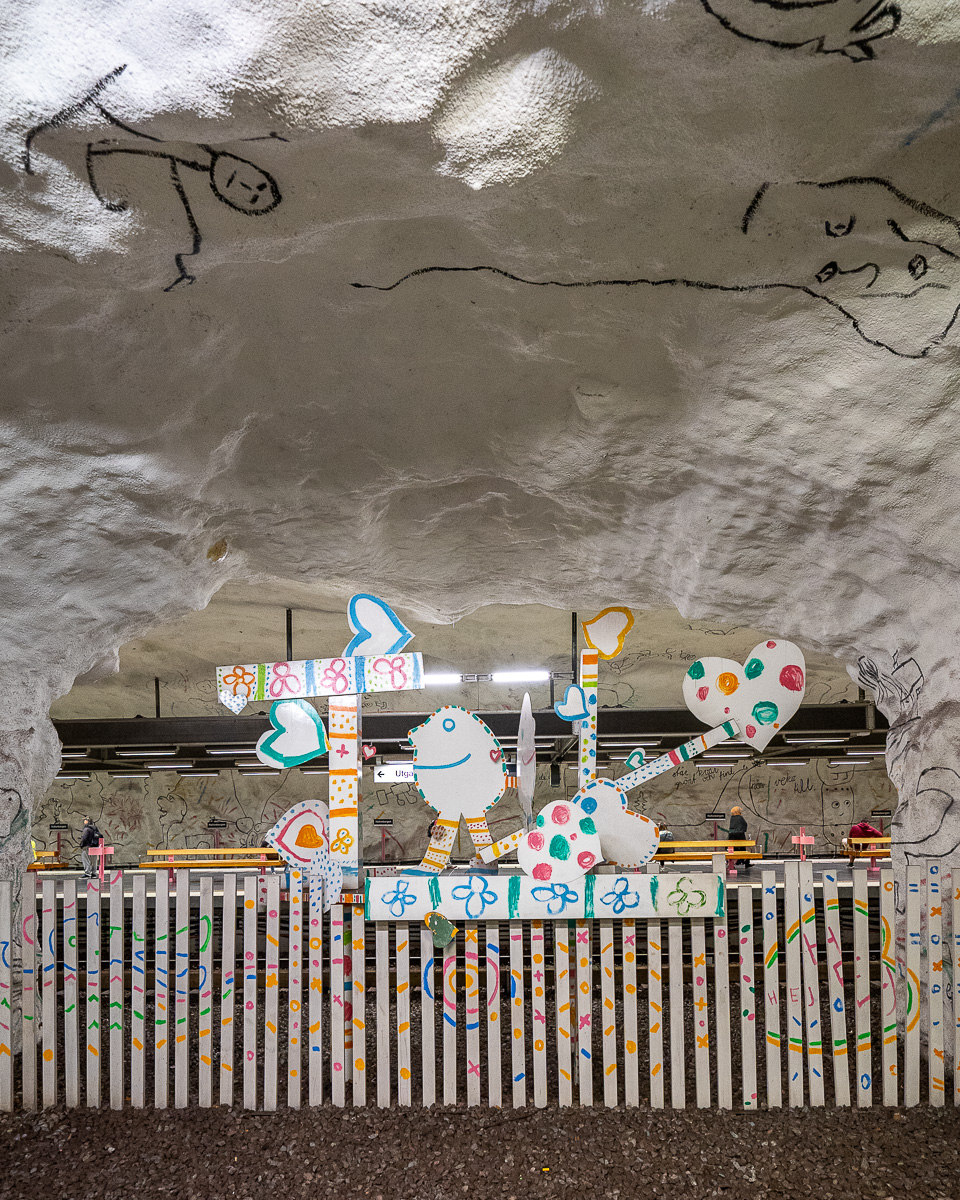 Warum man das gemacht hat? Stockholm besteht aus vielen Inseln, die aus Felsen bestehen. Daher wurden die U-Bahn-Linien samt Bahnhöfen wie Höhlen in Stein gegraben. Das sieht ehrlich gesagt nicht sehr einladend aus (kannst du an vielen Bahnhöfen sehen). Daher beschloss man, die graue und düstere Atmosphäre mit Kunst zu verschönern.