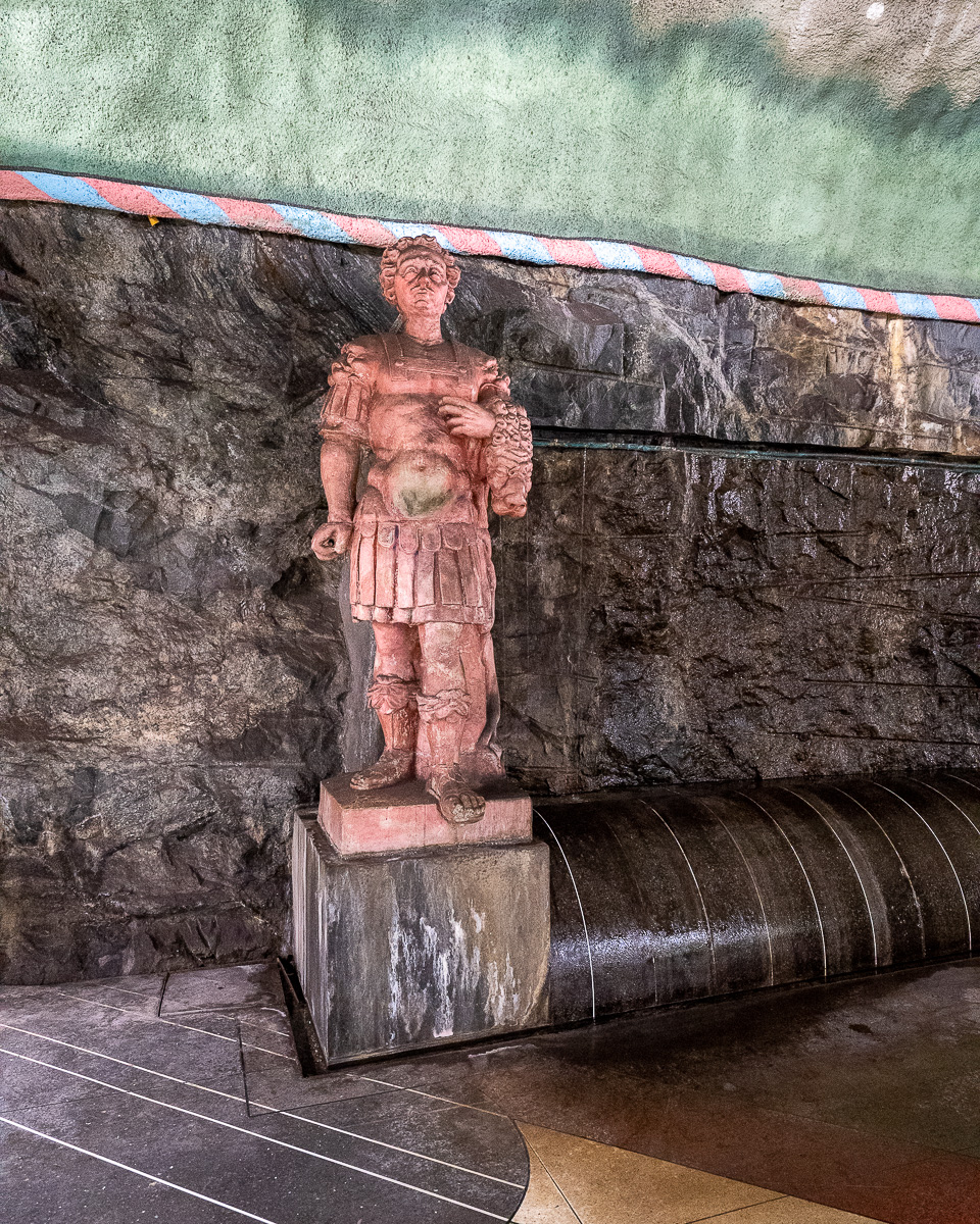 Ich habe mir den Bahnhof Kungsträdgården für das Ende der Tour aufgehoben, da er am meisten zu sehen ist. Das erste, was Sie bemerken werden, ist das rote, weiße und grüne Farbschema. Als nächstes werden Ihnen wahrscheinlich die Skulpturen auffallen: Es gibt wiedergewonnene Skulpturen aus abgerissenen Gebäuden rund um Stockholm, die in die Wände und in einem speziellen Ausstellungsbereich eingebettet sind. Es gibt auch ein verrücktes Mosaik-Deckendetail. Oh, und das ist die einzige Station mit lebenden Bewohnern: anscheinend gibt es eine Art Pilz und eine Art Höhlenspinne, die in der Station und nirgendwo anders leben. Ziemlich komisch!