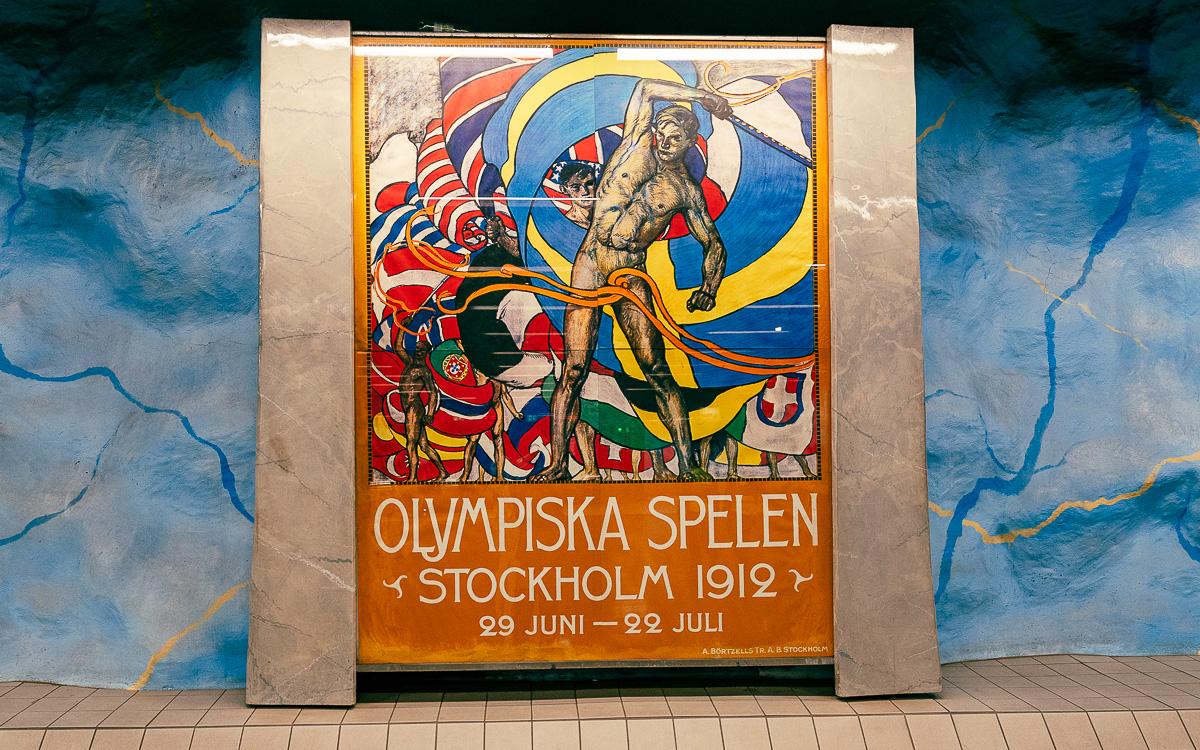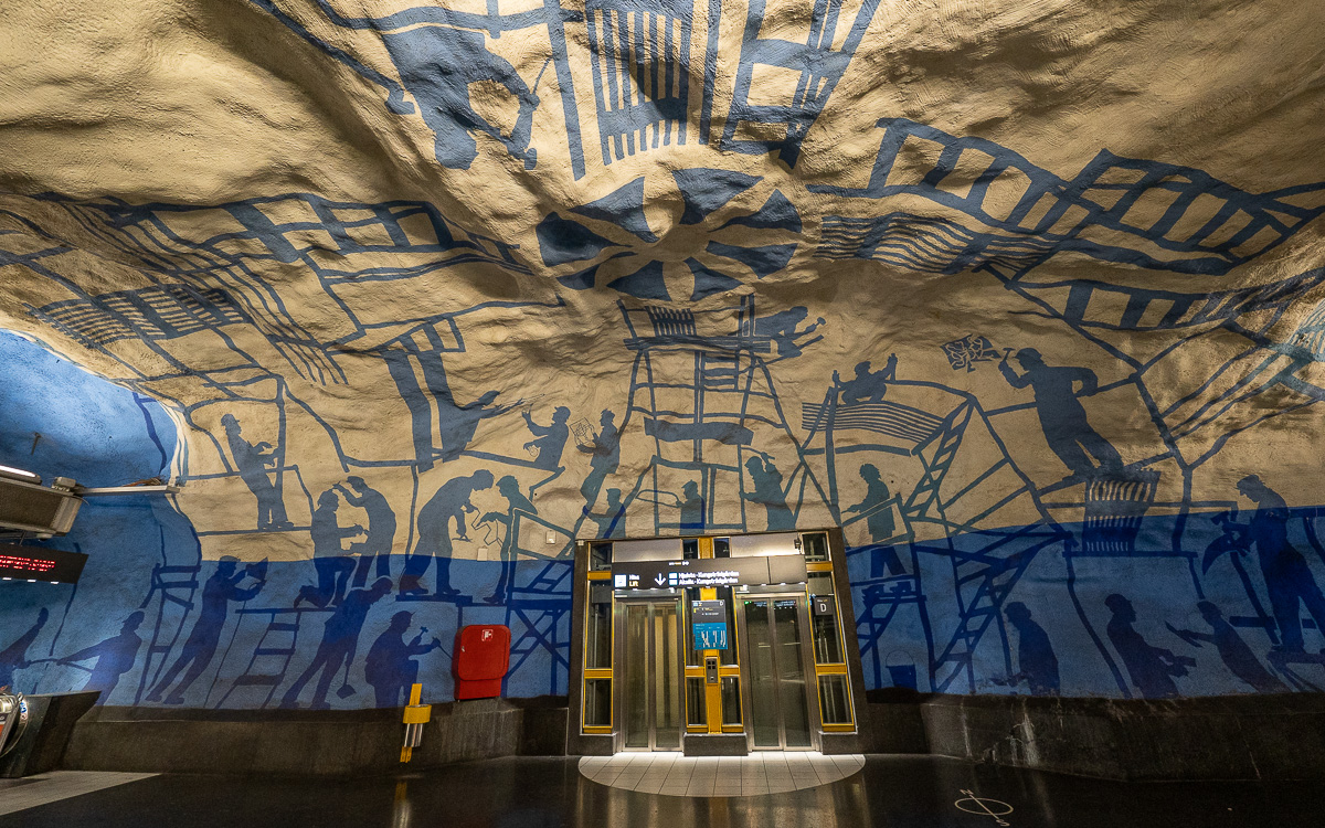 Ihre Tour endet auf dem blauen Bahnsteig des Bahnhofs T-Centralen. Der Künstler Per Olof Ultvedt hat diesen Bahnhof auf der blauen Linie mit verschiedenen blauen Motiven bemalt. Andere Teile des Bahnhofs ehren die Arbeiter, die den Bahnhof gebaut haben – Sie können ihre gemalten Silhouetten an Decken und Wänden sehen.