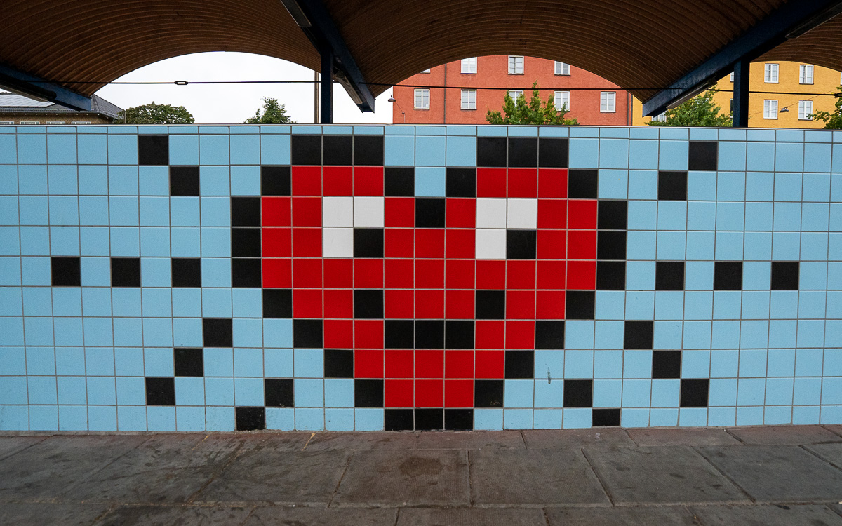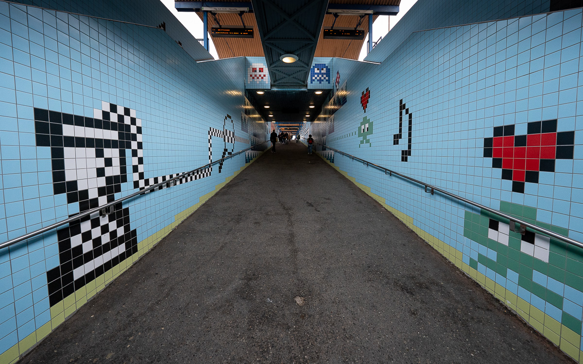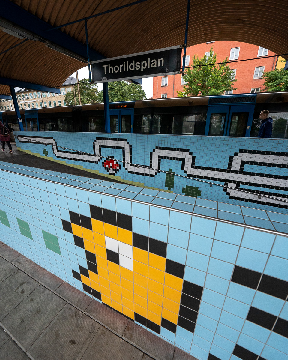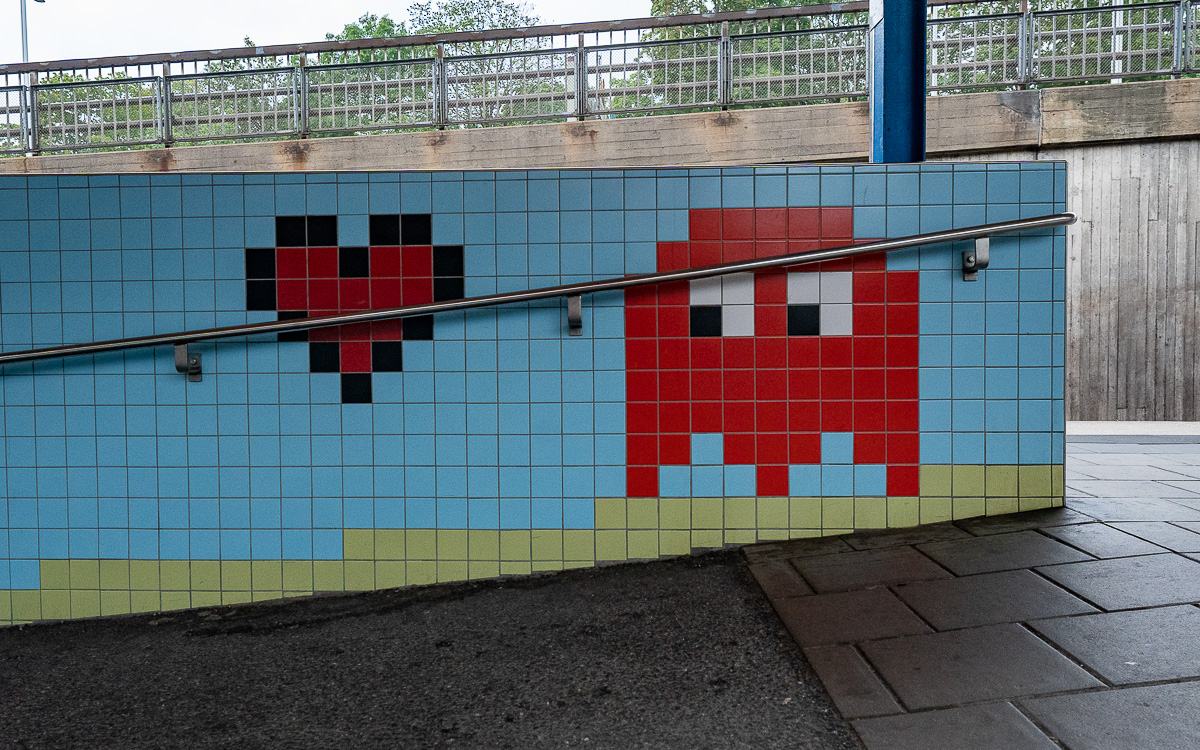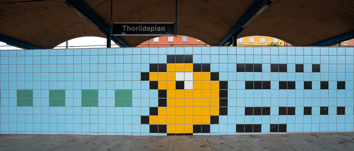 Diese Station befindet sich über der Erde und ist für mich ein absolutes Highlight. Denn hier findest du auf den Fliesen die Helden der Jugend: Super Mario Brothers, Space Invaders und PacMan. Der Künstler Lars Arrhenius hat hier tolle Arbeit geleistet, die mir ein breites Grinsen ins Gesicht zaubert. Ich liebe diese Station!