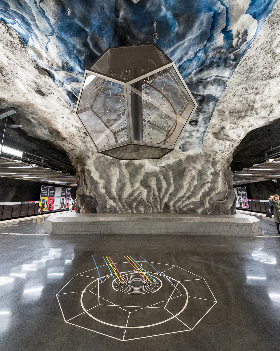 Diese Station dient dem Royal Institute of Technology (Technische Hochschule), daher ist es keine Überraschung, dass die Kunst in dieser Station wissenschaftlich und technisch ist. Mein Lieblingsobjekt ist das große Glaspolyeder in der Mitte des Bahnhofs.
