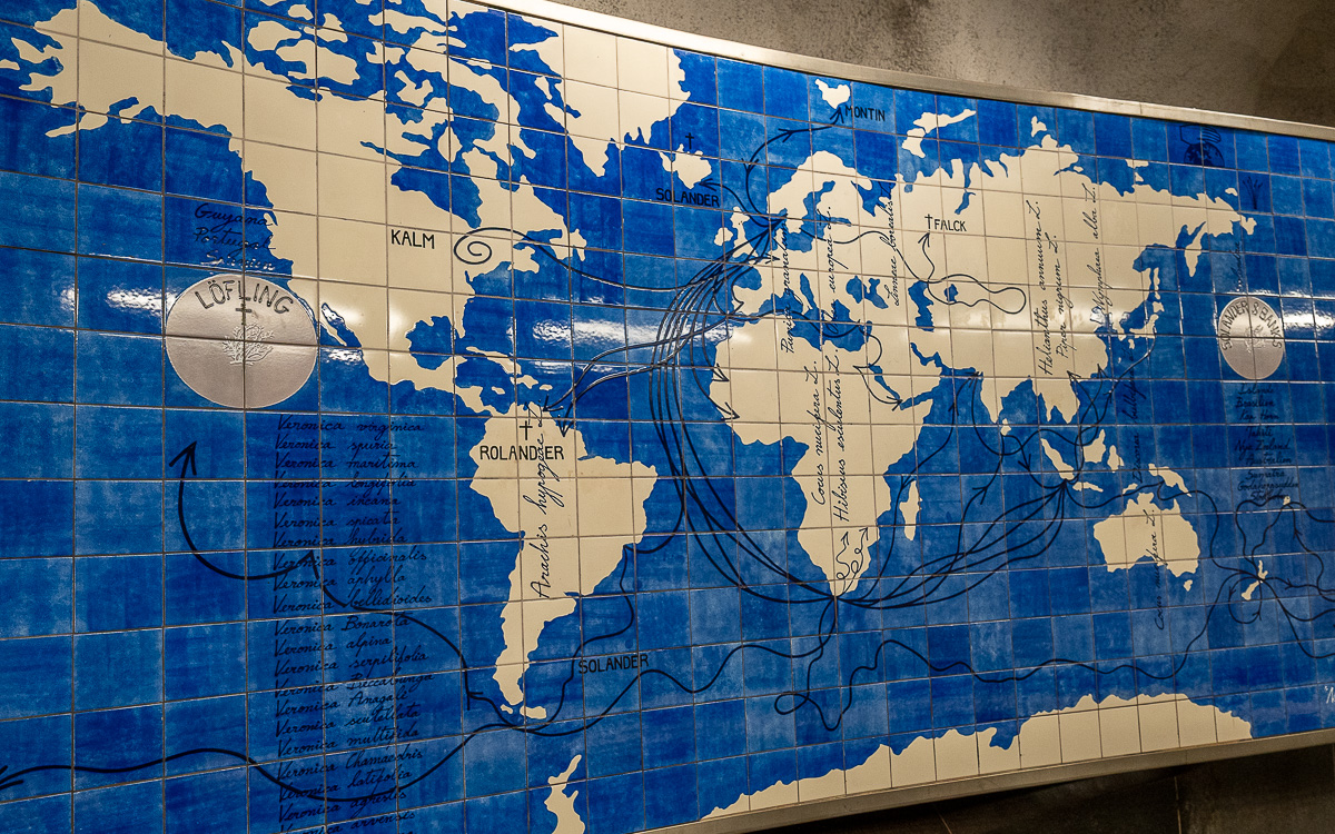 Die Fliesen wurden übrigens von einer belgischen Künstlerin in Lissabon gefertigt. Denn die portugiesische Hauptstadt Lissabon ist für diese Art Fliesen (azulejos) bekannt. Nach der Produktion wurden die Fließen aus Lissabon nach Stockholm gebracht und in dieser Universitet U-Bahn-Station installiert.