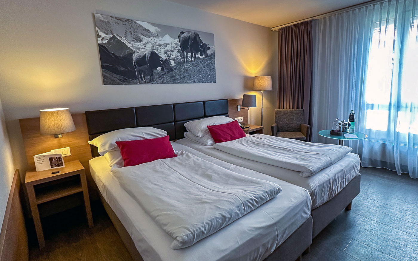 Das 4-Sterne Ameron Luzern Hotel Flora liegt mitten im Zentrum, nur wenige Meter von der Kapellbrücke entfernt. Ideale Lage für einen kurzen Besuch beim Roadtrip. Das Frühstückhuffett ist groß, die Räume lassen das Herz vor allem bei Radfahr-Fans höher schlagen. Die Zimmer waren geräumig und modern.