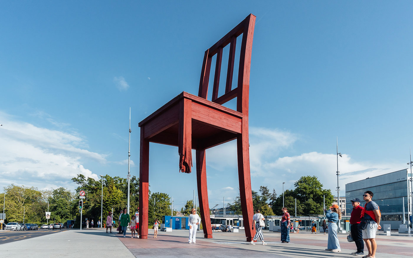 - Genf und die United Nations: Palais des Nations, ehemals das Hauptquartier des Völkerbundes, ist heute Sitz der Vereinten Nationen in Genf im wunderschönen Ariana-Park. Bibliothek des Palais des Nations und das UN-Museum, indem du mehr über die Geschichte und Arbeit der Vereinten Nationen erfahren kannst und der Broken Chair (Zerbrochener Stuhl) ist eine riesige und massive Skulptur auf dem Platz der Nationen in Genf, direkt vor dem Hauptgebäude der Vereinten Nationen. Er ist ein politisches Symbol, das für das Verbot von Landminen und Streubomben steht.