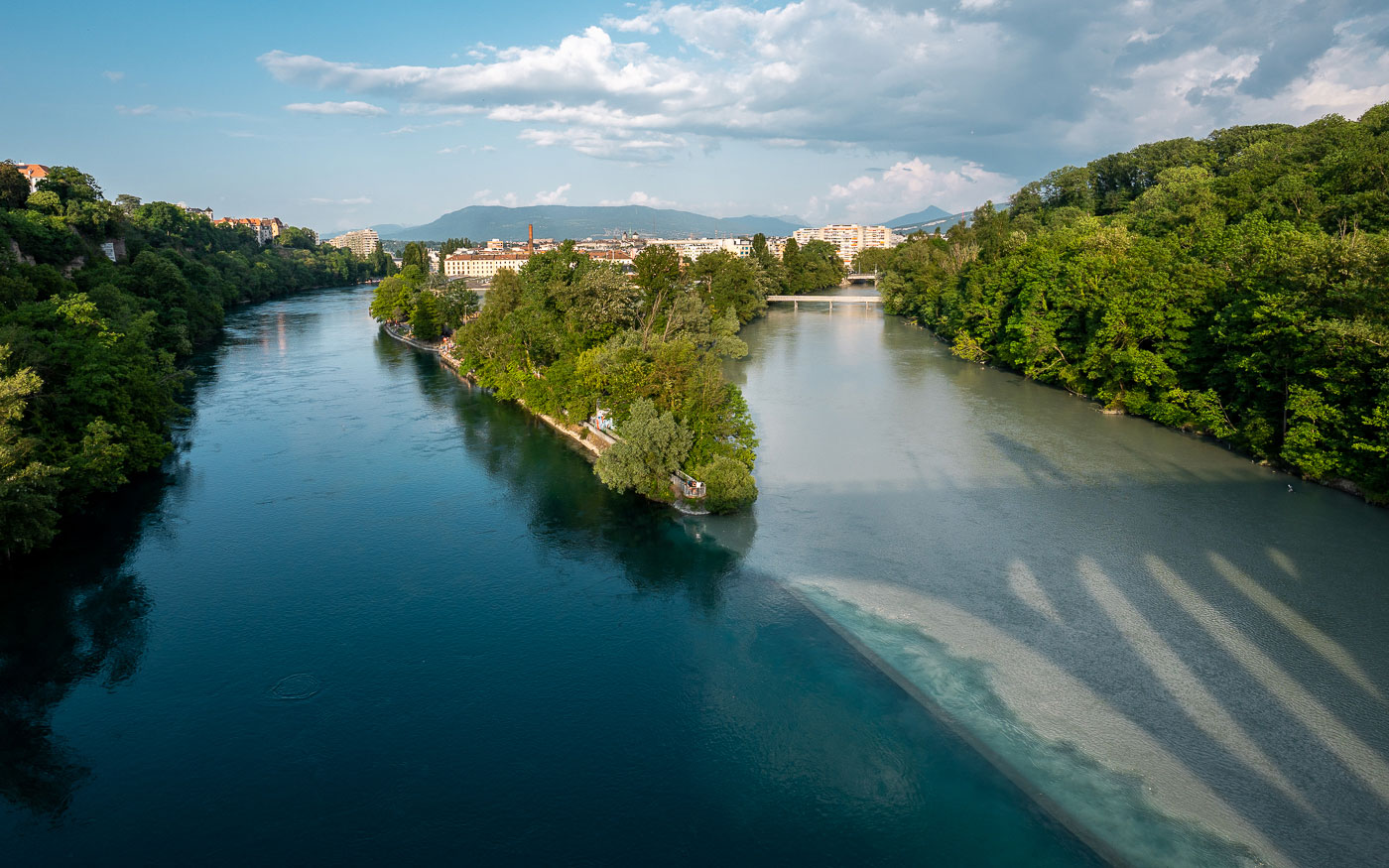 - Am "Pointe de la Jonction" treffen die beiden Flüsse Rhône und Arve aufeinandertreffen. Die Arve, die aus den Alpen kommt und viel Sediment mit sich führt, hat eine dunklere Farbe, während der Rhône, der aus dem Genfersee fließt, eine hellere Farbe hat. An der Pointe de la Jonction kann man deutlich sehen, wie die beiden Flüsse nebeneinander fließen, bevor sie sich vermischen. Am Pointe de la Jonction treffen sich die Locals zum Schwimmen und chillen an den Flüssen.