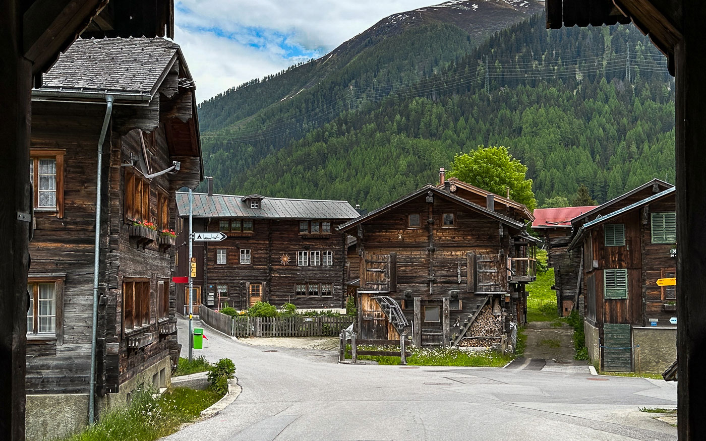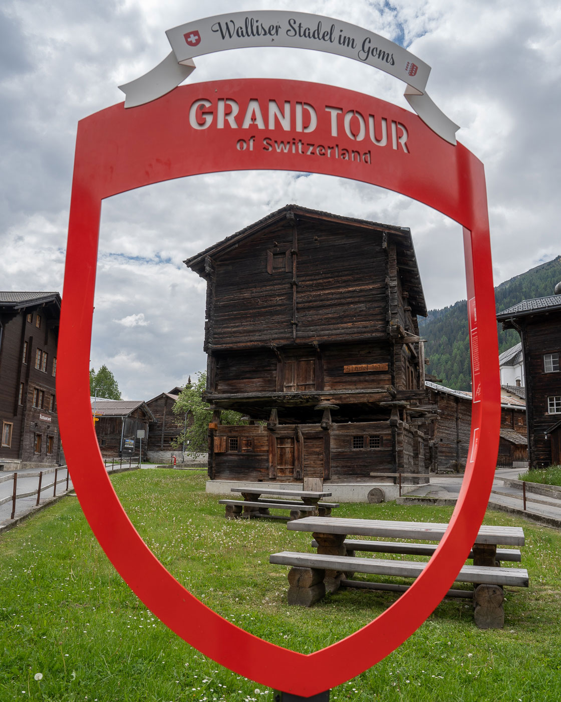 In Oberwald angelangt, halten wir in den idyllischen Bergdörfern und finden einen weiteren Fotospot der Grand Tour of Switzerland. Im Dorf Goms sind die Häuser alle aus Holz und der Walliser Stadel aus dem Jahr 1617 gibt das perfekte Motiv mit Grand Tour-Schild ab. Wir genießen die weitere Fahrt durch die Alpen, auch ohne Furkapass.