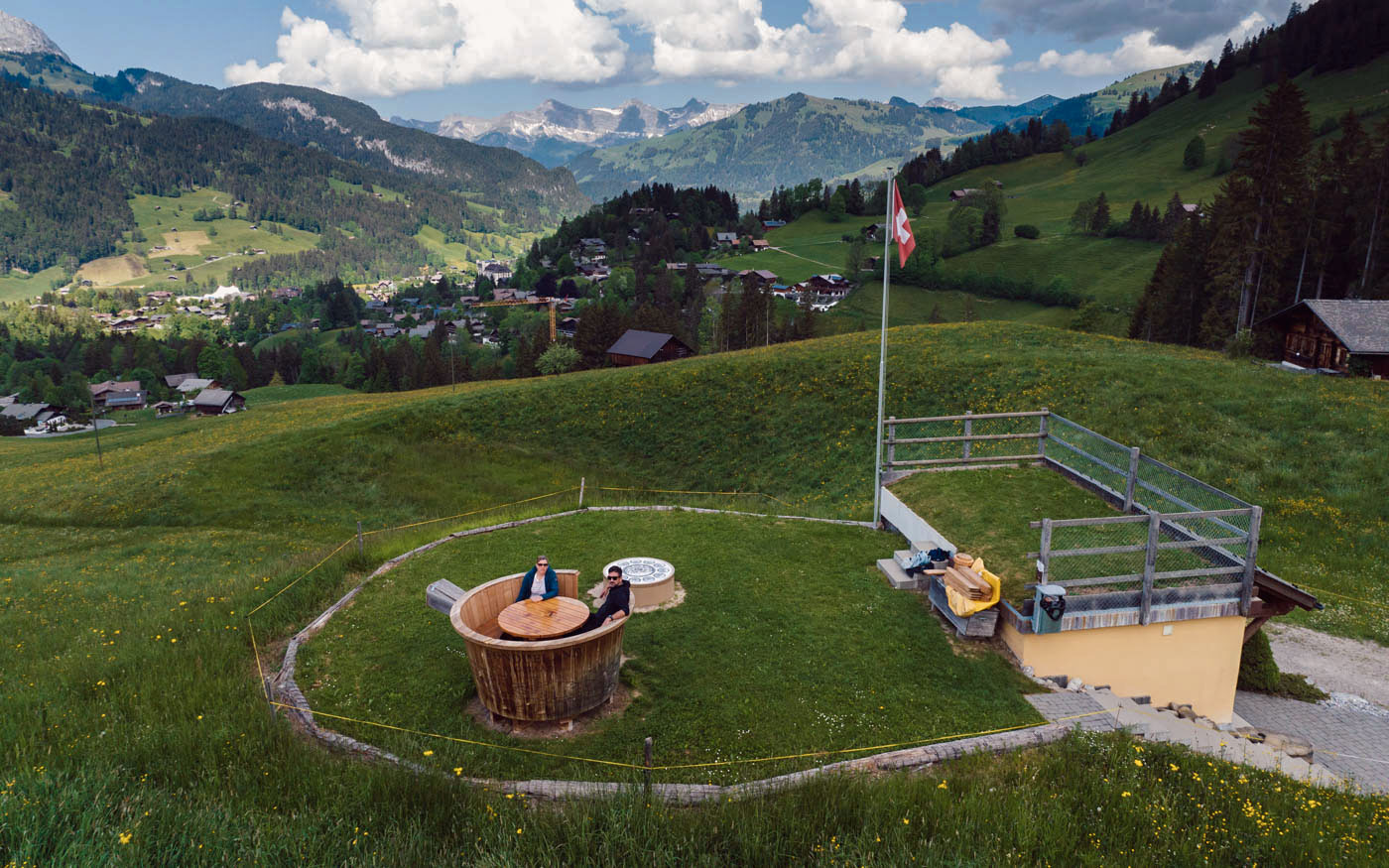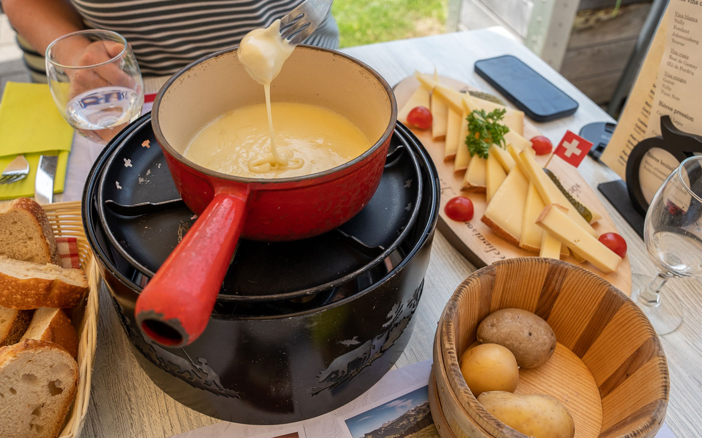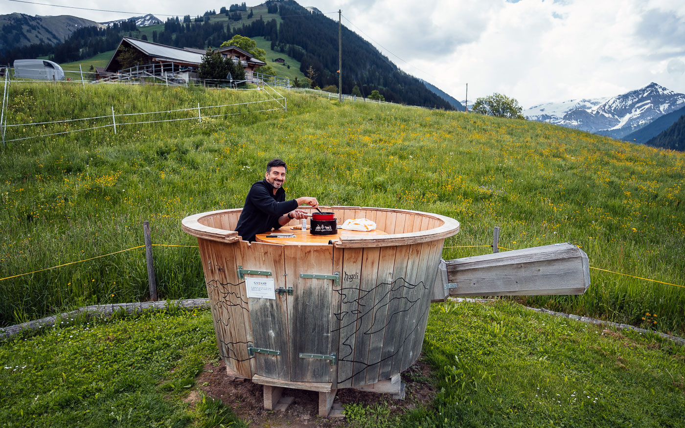 Nachdem wir die Führung beenden, geht es zum gemütlichen Teil: Wir packen unseren Fondue Rucksack aus und essen Käsefondue in einem überdimensionalen Fondue-Topf (Fondue Caquelon genannt). Dabei haben wir eine grandiose Aussicht auf das Tal, die Berge und das Dorf Gstaad. Das Essen ist ein wirkliches Highlight unseres Roadtrips in der Schweiz.