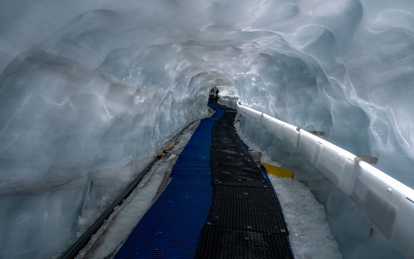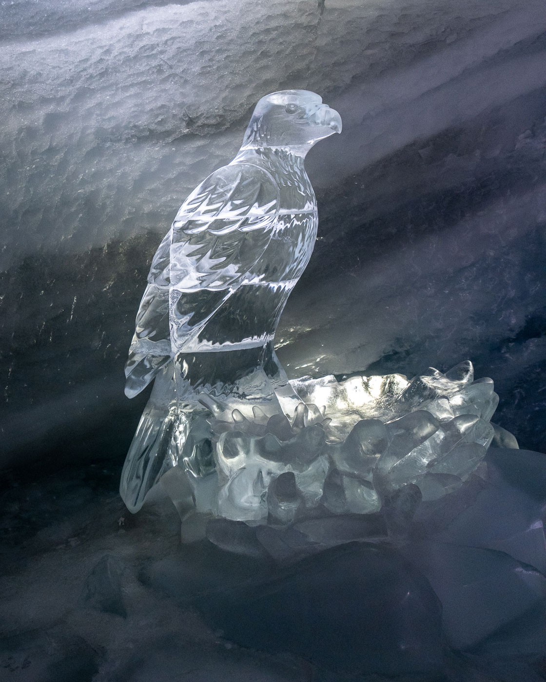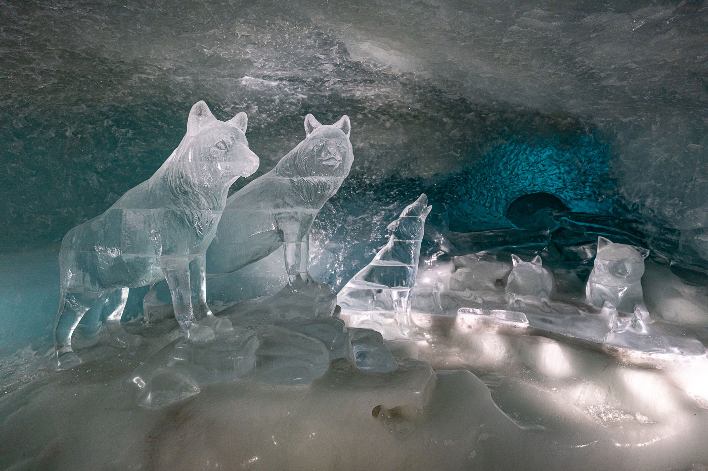 Ehe wir uns im Restaurant bei einem frühen Mittagessen aufwärmen, nehmen wir den Fahrstuhl unter die Erde. 15 Meter tiefer sind Tunnel ins Eis geschlagen. Du hast hier die Möglichkeit, in eine tiefe Gletscherspalte zu blicken und Eiskünstler bei der Arbeit zu beobachten. Es gibt auch eine kleine Eisrutschbahn neben den Eisskulpturen zu betrachten. Das Funkeln der Eiskristalle ist irgendwie magisch.