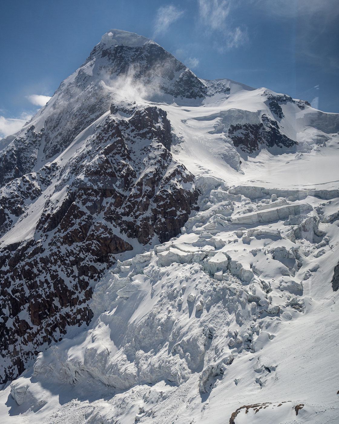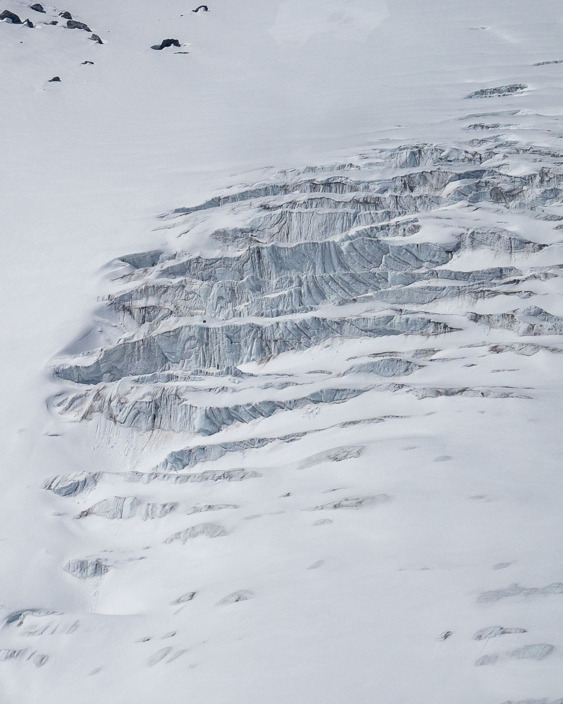 Am Morgen fahren wir mit einer der ersten Gondeln hinauf ins Matterhorn Glacier Paradise. Die Bergbahn ab Trockener Steg auf das Klein Matterhorn ist die höchstgelegene Hochleistungsbahn Europas. Die 3S Bahn (die Gondeln werden von zwei Seilen getragen und einem mittleren Seil gezogen) hat sogar designte Panoramakabinen namens "Crystal Ride" (separate Warteschlange) mit einem Glasboden. Kurz vor dem Passieren des Gletscher verwandelt sich das Milchglas und gibt freie Sicht auf den 170 Meter tiefer liegenden Theodulgletscher. Ich liebe Gletscher und deren Strukturen zu beobachten.