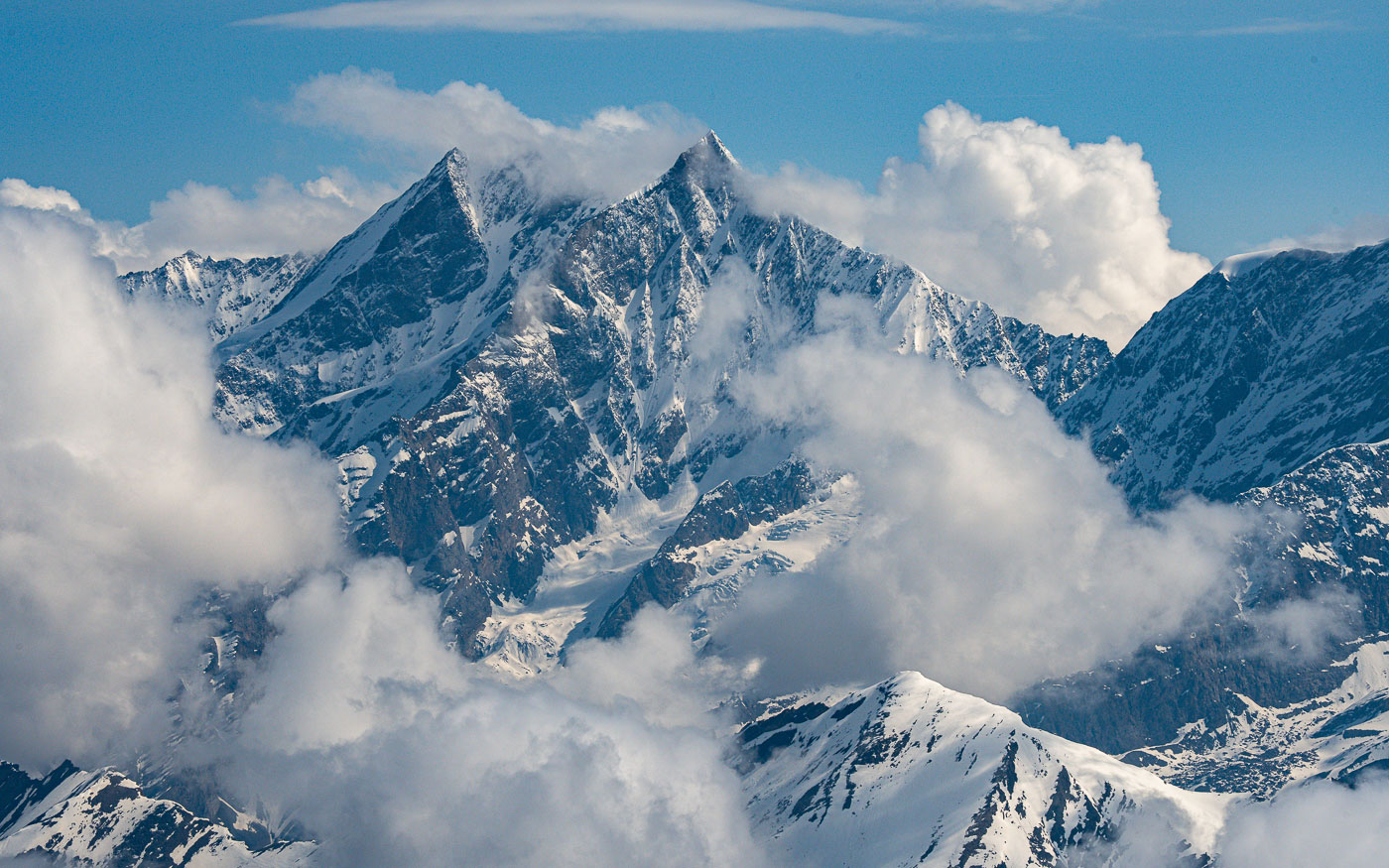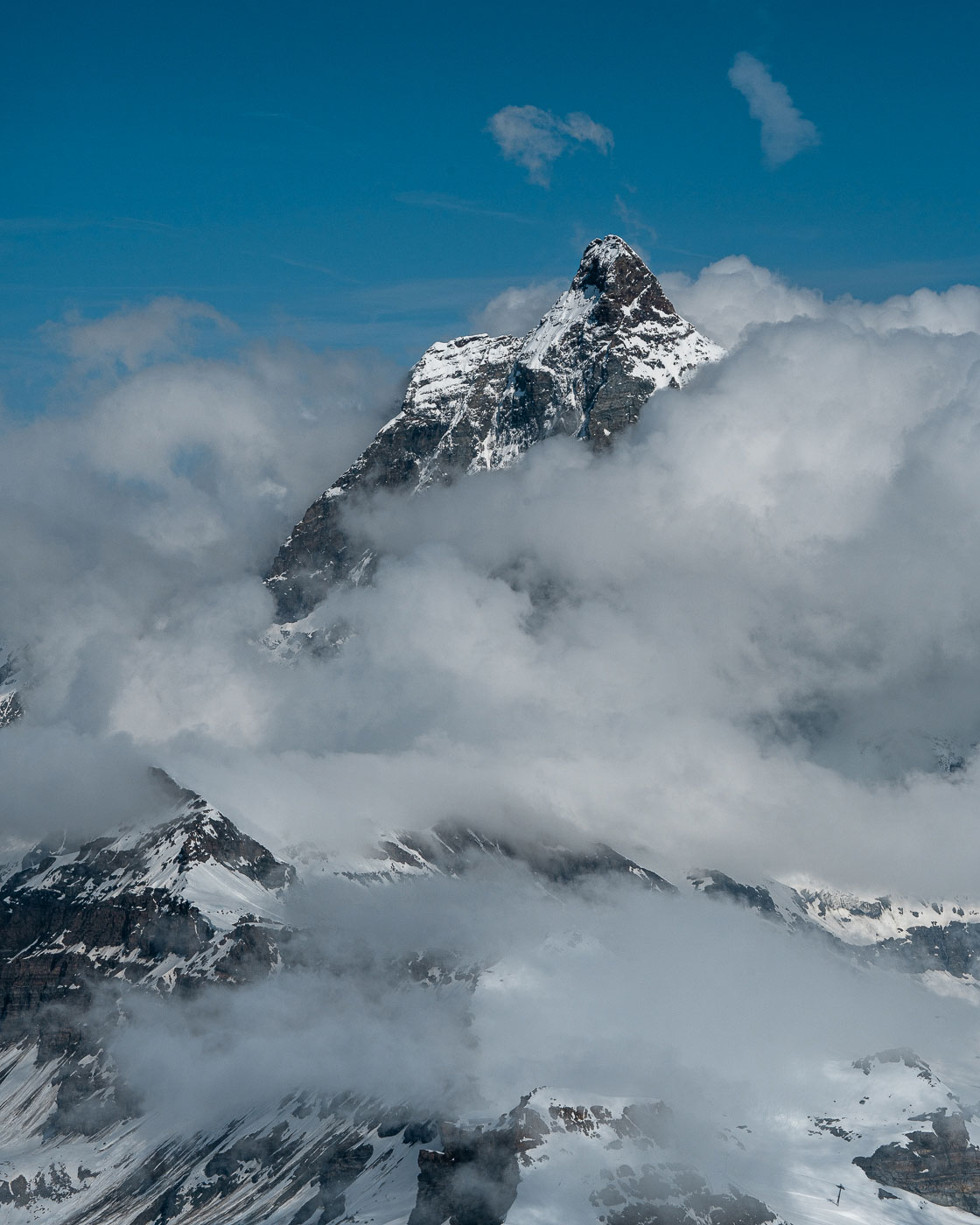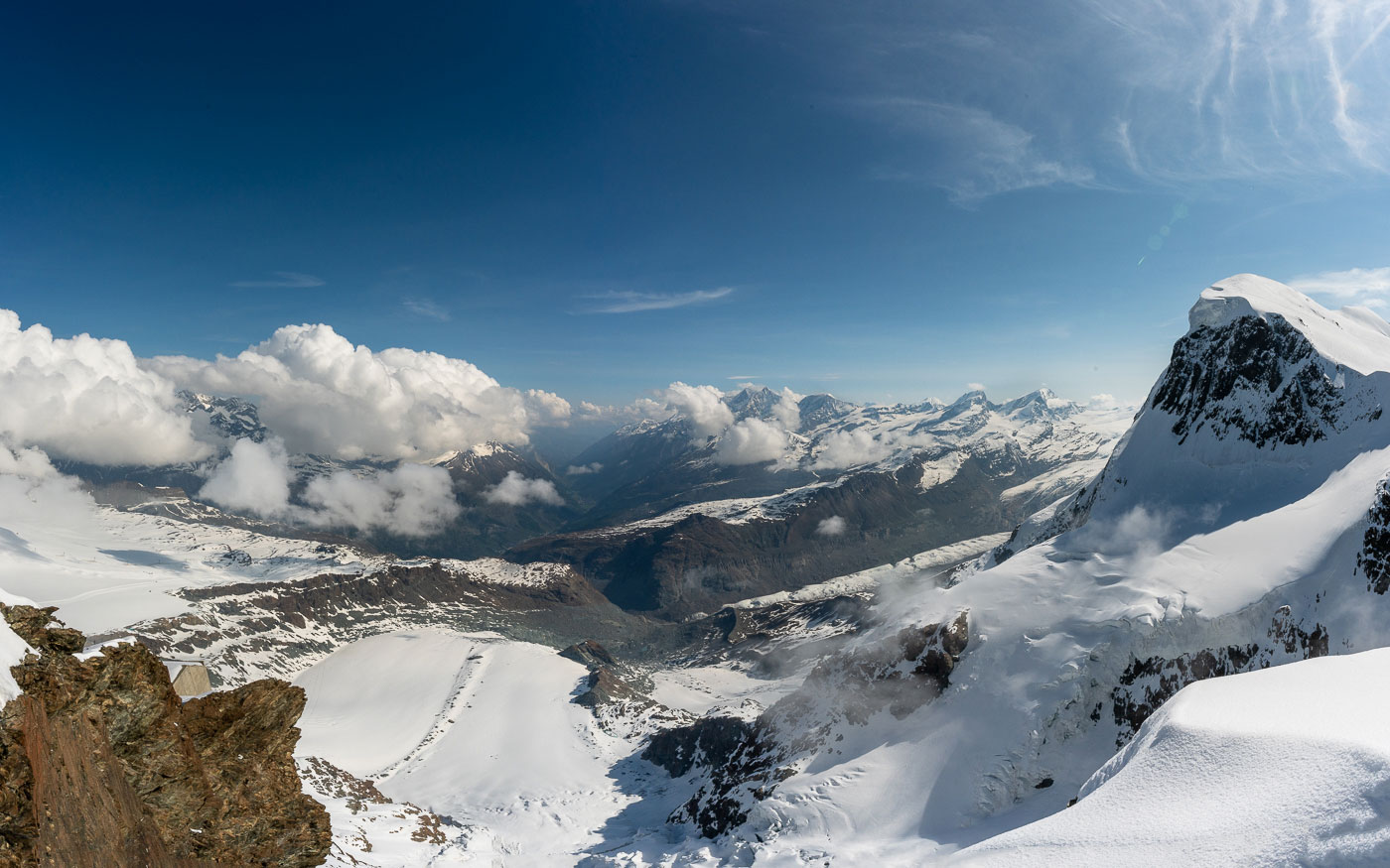 Anschließend gegen wir die letzten Stufen zur Aussichtsplattform, um nicht nur das Matterhorn, sondern auch viele andere 4000-er Berge zu erspähen. Die Wolken wandern schnell, so ist oft nur ein wenig Geduld nötig. Zwiebel-Look ist hier oben angesagt. Die Daunenjacke bei -3° Grad auch im Sommer Pflicht. An Handschuhe haben wir dummerweise nicht gedacht, denn der Wind hier oben ist eisig. Die Aussicht dafür fanatisch. Nur wenige Skifahrer begegnen uns in der Gondel. Vom letzten Besuch weiß ich allerdings, dass hier oben viele Nationalteams auch im Sommer trainieren. Also sei nicht verwundert, wenn ein Weltstar mit Skiern die Gondel mit dir betritt.
