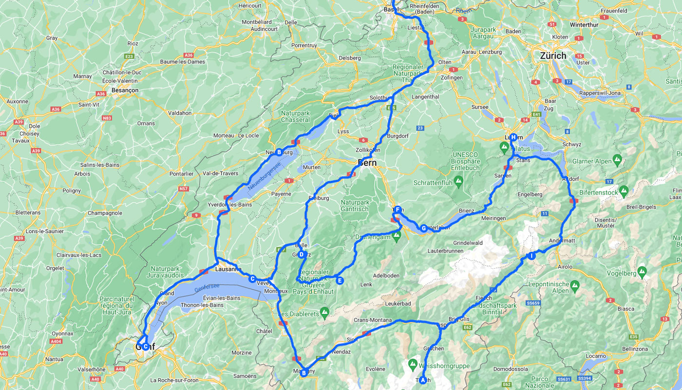 - Tag: Vom Weinbaugebiet Lavaux am Genfersee geht es entweder zurück nach Genf oder wie wir: zurück in die Heimat. Zu den Highlights gehören das Weinbaugebiet Lavaux, sowie Zwischenstopps in Fribourg und Basel am Dreiländereck.