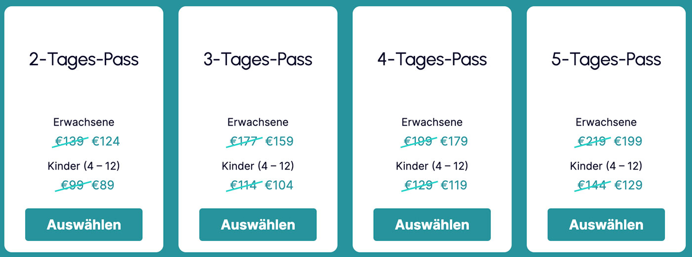 Die Preise variieren je nach Gültigkeitsdauer. Für Erwachsene (ab 13 Jahren) kostet der Pass für 2 Tage 124 Euro, 3 Tage 159 Euro, 4 Tage 179 Euro und 5 Tage 199 Euro. Für Kinder (4 – 12 Jahre) sind die Preise entsprechend 89 Euro, 104 Euro, 119 Euro und 129 Euro. Bitte prüfe die Preise auf der offiziellen Webseite, da diese im Jahr mehrfach angepasst werden (Stand 09/2023).