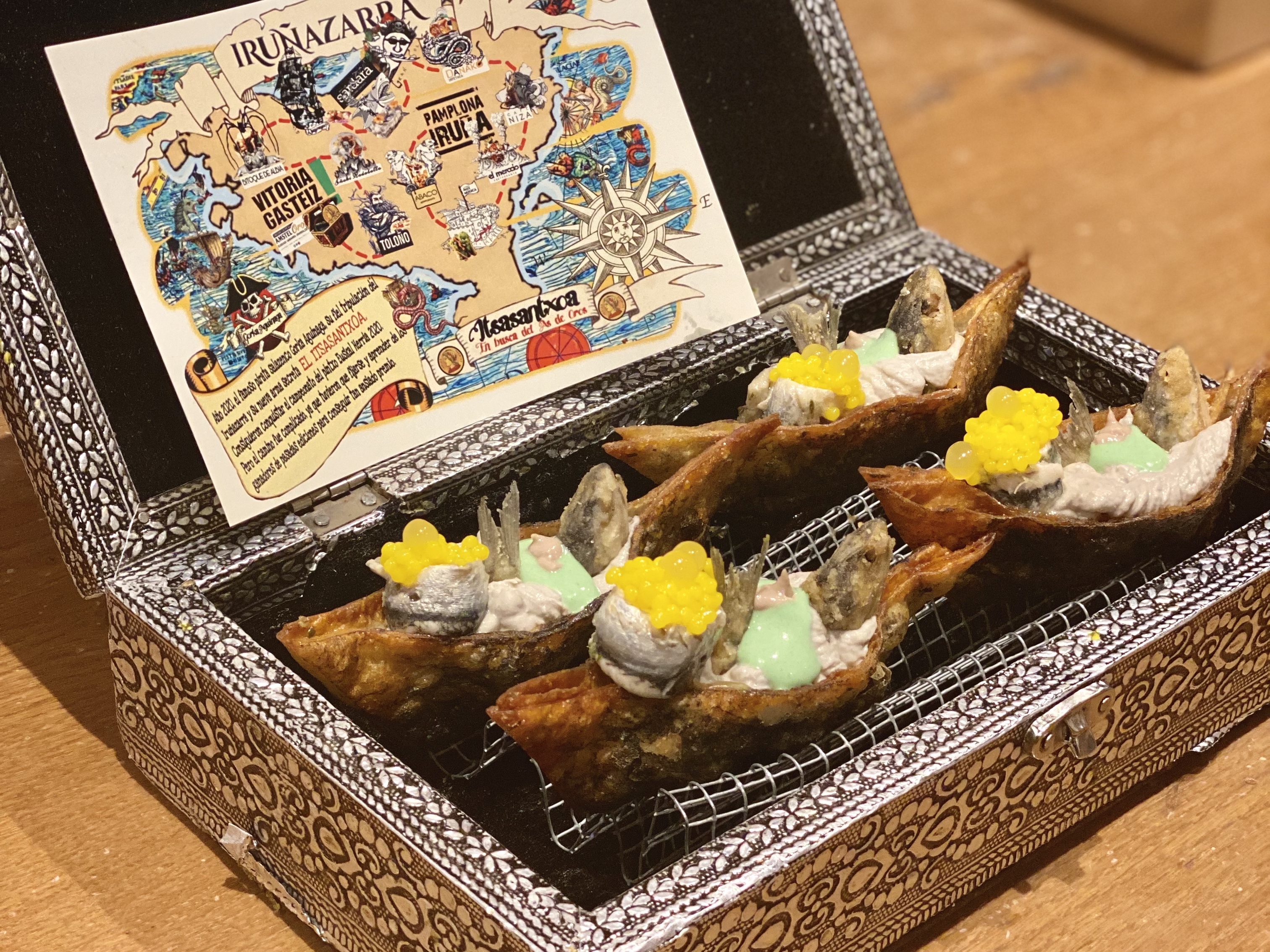 Letztjähriger Gewinner der "Besten Pintxos Pamplonas" war die Bar "Iruñazarra" in der Altstadt – genauer gesagt brachten seine Itsasantxoas den Sieg nach Hause. Dieses kleine Boot aus mexikanischer Pasta mit Guacamole und hausgemachter Sardellenpastete ist nicht nur hübsch anzuschauen, sondern schmeckt ausgezeichnet. Ein salzig-cremiger Happen der bereits beim Vertilgen nach dem nächsten Caña (einem kleinen Bier) schreit.