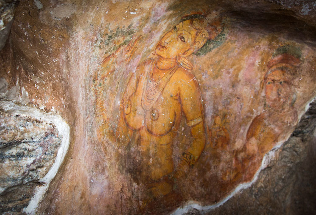Über eine eiserne Wendeltreppe gelangst du zu einem Felseinschnitt und den berühmtesten Wandmalereien Sri Lankas: den bunten Felsenfresken der Wolkenmädchen oder Sigiriya-Mädchen. Das sind filigrane Malereien von schwebenden Frauen aus dem 5. Jahrhundert, bei welchen sich so mancher Besucher lautstark fragt, ob es damals schon Silikonbrüste gab. Kein Witz.