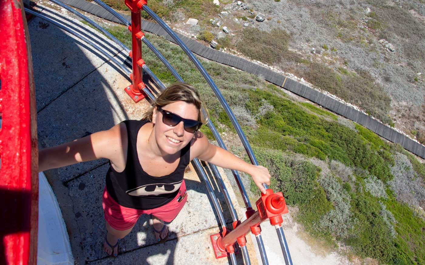 Für Schwindelfreie geht es über 71 Stufen hinauf auf die Plattform des Turms, von wo aus du einen tollen Panoramablick auf den Agulhas National Park bekommst.