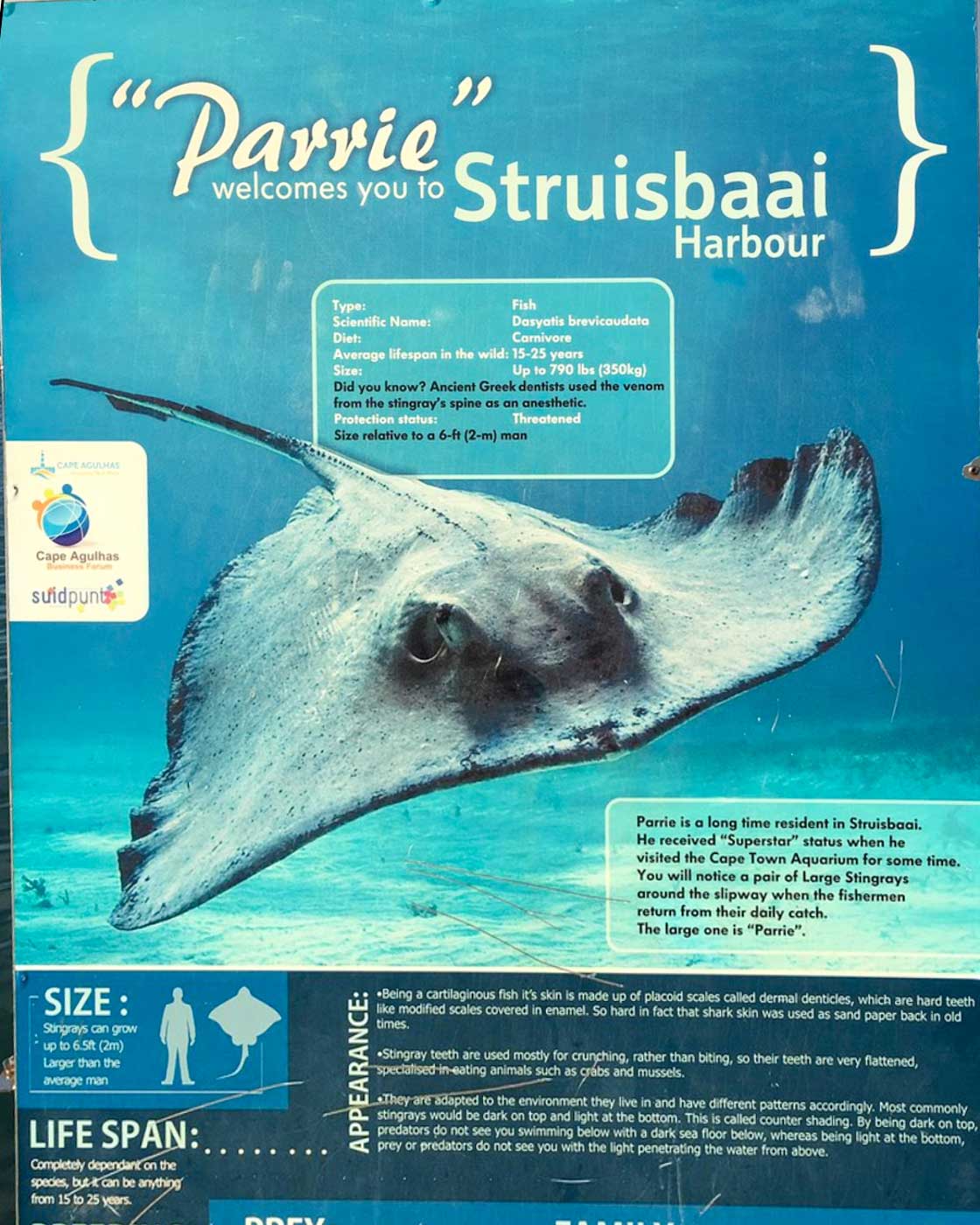 Ein weiteres Highlight beim Cape Agulhas ist der kleine Fischerort Struisbaai. Am Hafen findest du den Stachelrochen "Parrie" und manchmal noch weitere im seichten Wasser. Da die Fischerboote ihre Fischabfälle hier ins Wasser werfen, folgen die cleveren Rochen der einfach zugänglichen Nahrungsmittelquelle.
