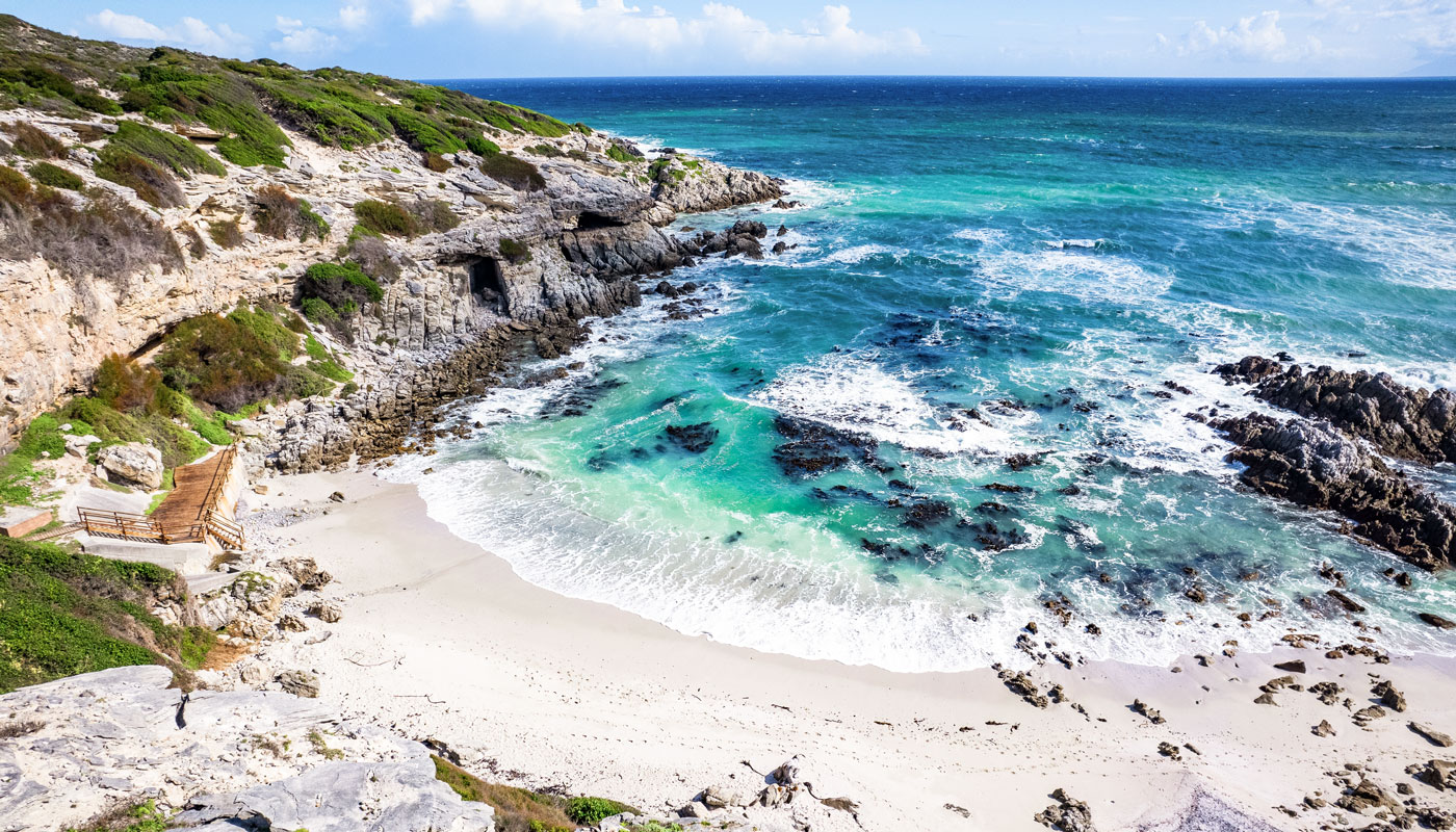 Der bekannteste Strand ist der Grotto Beach, der sich über 18 Kilometer bis De Kelders erstreckt. Weitere schöne Strände sind Skulpiesbaai Beach, Langbaai Beach, Kammabaai Beach und Voëlklip Beach, die du auch während einer Wanderung auf dem Cliff Path entdecken kannst.