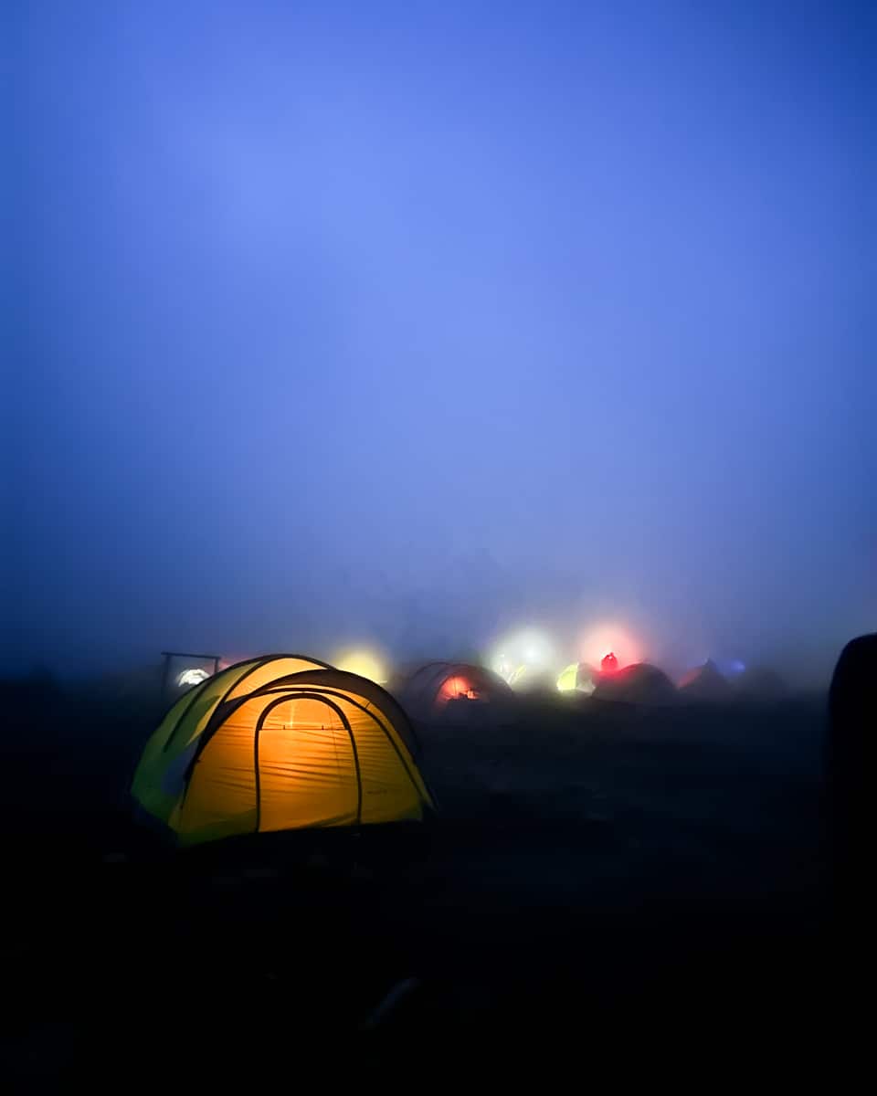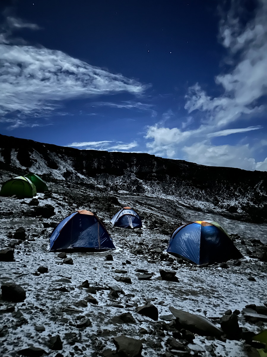Ab jetzt galt nur eins: schnell essen, dann den Rucksack für die Gipfelnacht packen und versuchen, sich auszuruhen – die meisten können auf dieser Höhe kaum Schlaf finden. In den wenigen Stunden, in denen wir ebenjenen suchten, schickte der Berg bedrohliche Windböen und Schnee um unsere Zelte, als wollte er sagen: Seht euch vor!