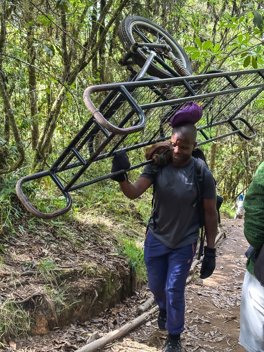 Mehr noch: Diesmal kam uns sogar ein kräftiger Mann entgegen, der ein „Kilimandscharo Taxi“ auf dem Kopf nach oben trug. Dieses Einrad-Liege-Gefährt diente dem Transport etwaiger Verletzter in Richtung Stadt, denn der Helikopter kann bei Notfällen nicht immer fliegen. Ob man sich aber diese "African Massage" auf dem unebenen Terrain antun will, ist fraglich ...