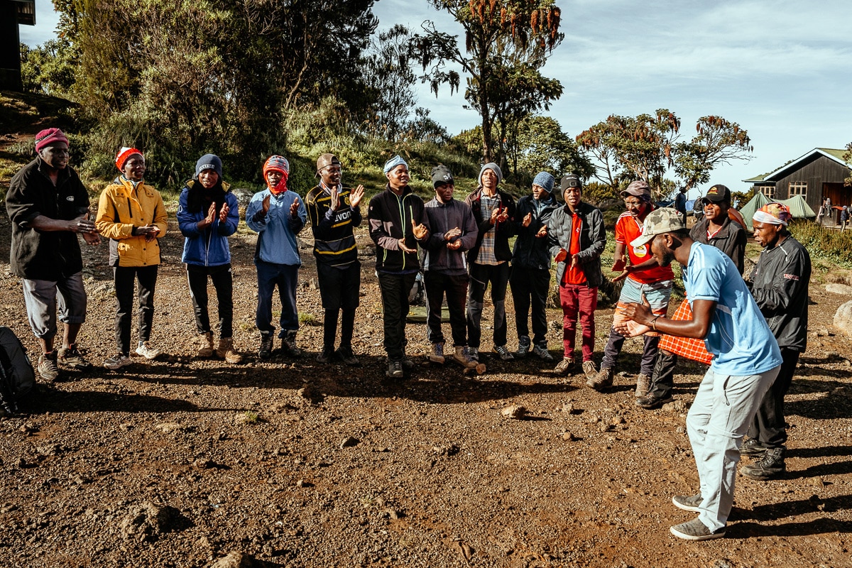 Um 8 Uhr versammeln wir uns zu einem kleinen Klatsch-, Sing- und Tanzkreis mit all unseren Guides, Küchenpersonal und Trägern zusammen. Das Team fasst 15 Leute, nur für uns fünf Amateur-Bergsteiger. Zusammen besingen wir mit "Jambo Bwana" von den "Them Mushrooms" den Berg, die Gruppe und unseren Aufstieg. Das sorgt für eine positive Stimmung, wenngleich wir zu diesem Zeitpunkt noch nicht wissen, dass wir diesen Song über die nächsten Wochen nicht mehr aus unseren Gehörgängen bekommen sollten.