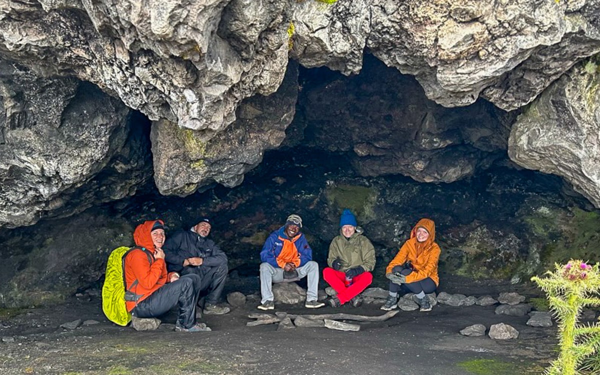 Nach einem warmen, vorzüglichen Mittagessen mit Pasta und Fleischsauce sowie Einrichten unserer Zelte erkundeten wir mit Hans und Andrew die Gegend. Knappe zwei Stunden gingen wir durch die Höhen, auf etwa 3.900 Meter, und besuchten das naheliegende Shiva II Camp sowie Lava Höhlen. Wunderbar für die Akklimatisierung.