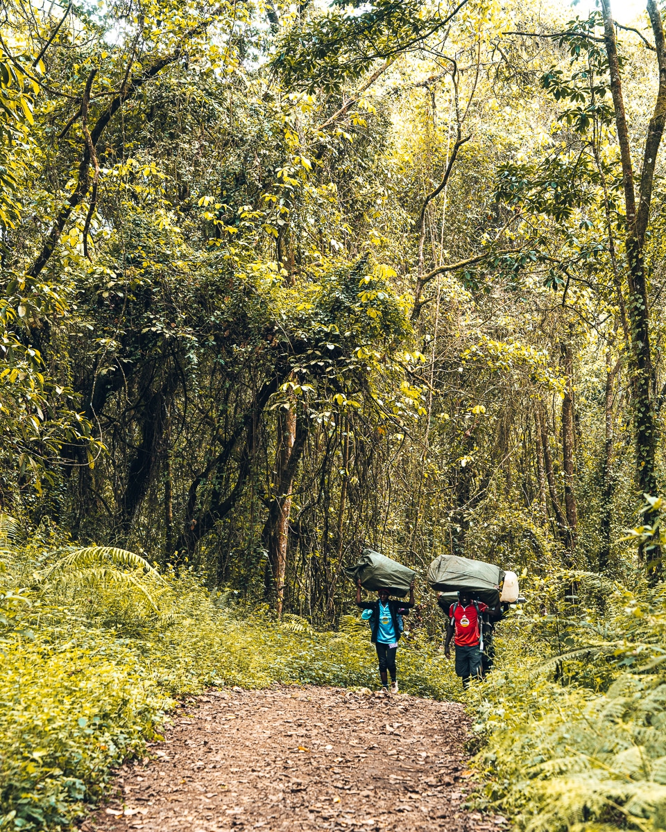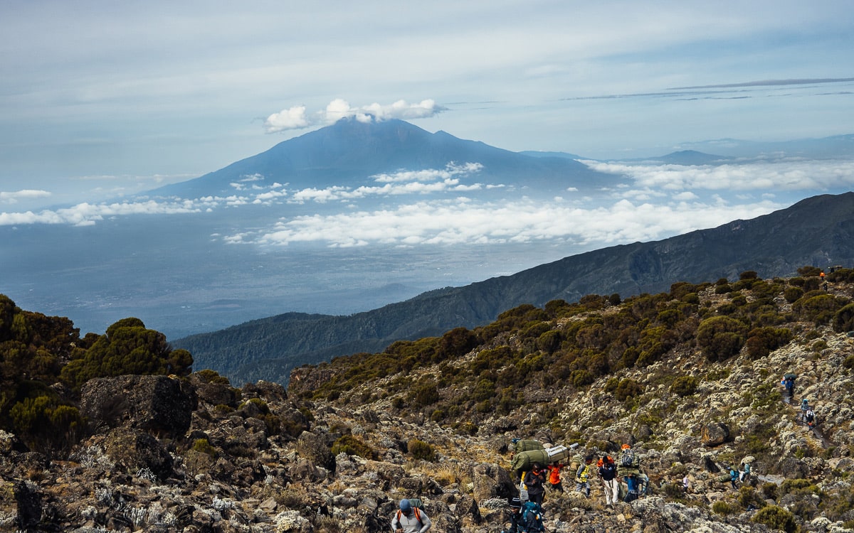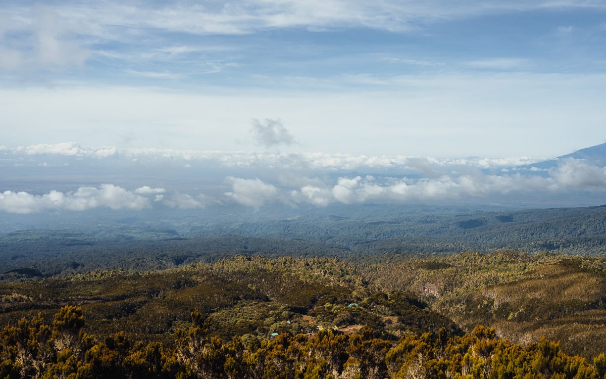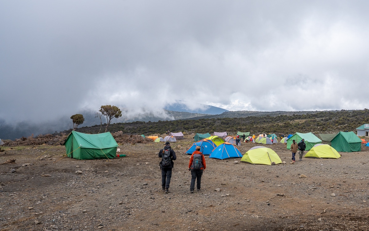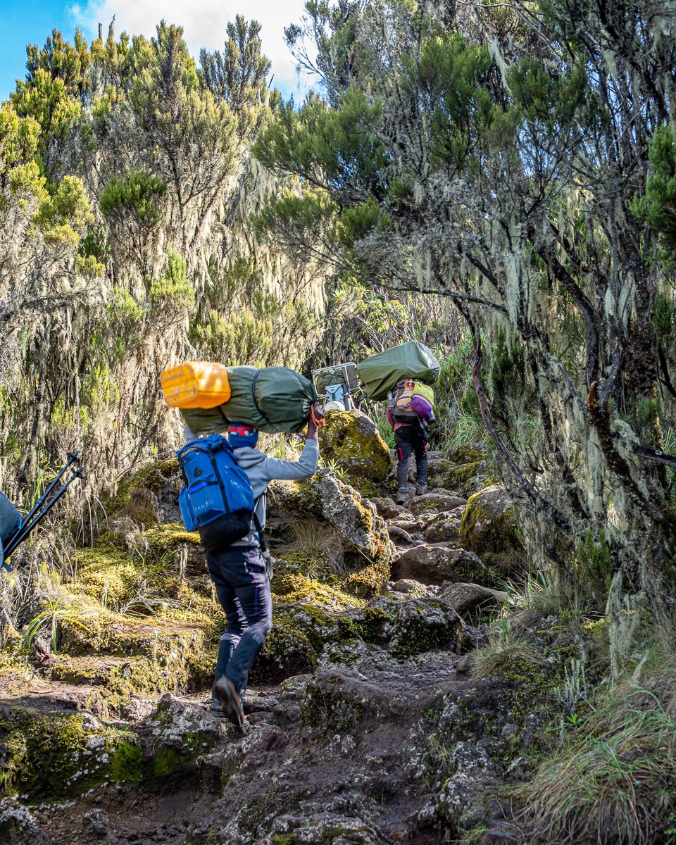 Etwa fünf Stunden, fast 13 Kilometer und etwas mehr als 2.000 Höhenmeter trennten uns vom Mweka Gate. Dabei überholten uns wieder unzählige Träger mit ihrem aberwitzig schweren Gepäck im rasanten Tempo.