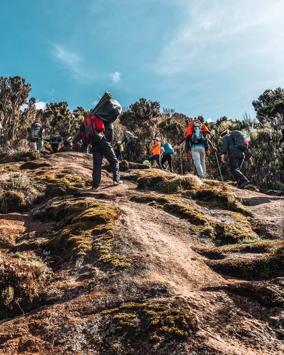Mit prall gefüllten Bäuchen geht es weiter hinauf. Immer in kleinen Trippelschritten, damit wir uns an die Höhe gewöhnen. Die Einheimischen nennen das "Pole Pole", sehr langsam. Überhaupt herrscht überall – sowohl bei uns als auch den Guides – eher lässige Stimmung, ein "Hakuna Matata!" hier und ein "Mambo Djambo!" verdeutlichen die Gelassenheit.