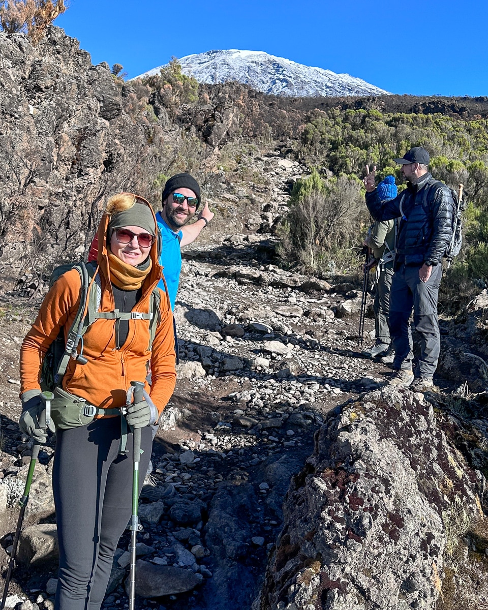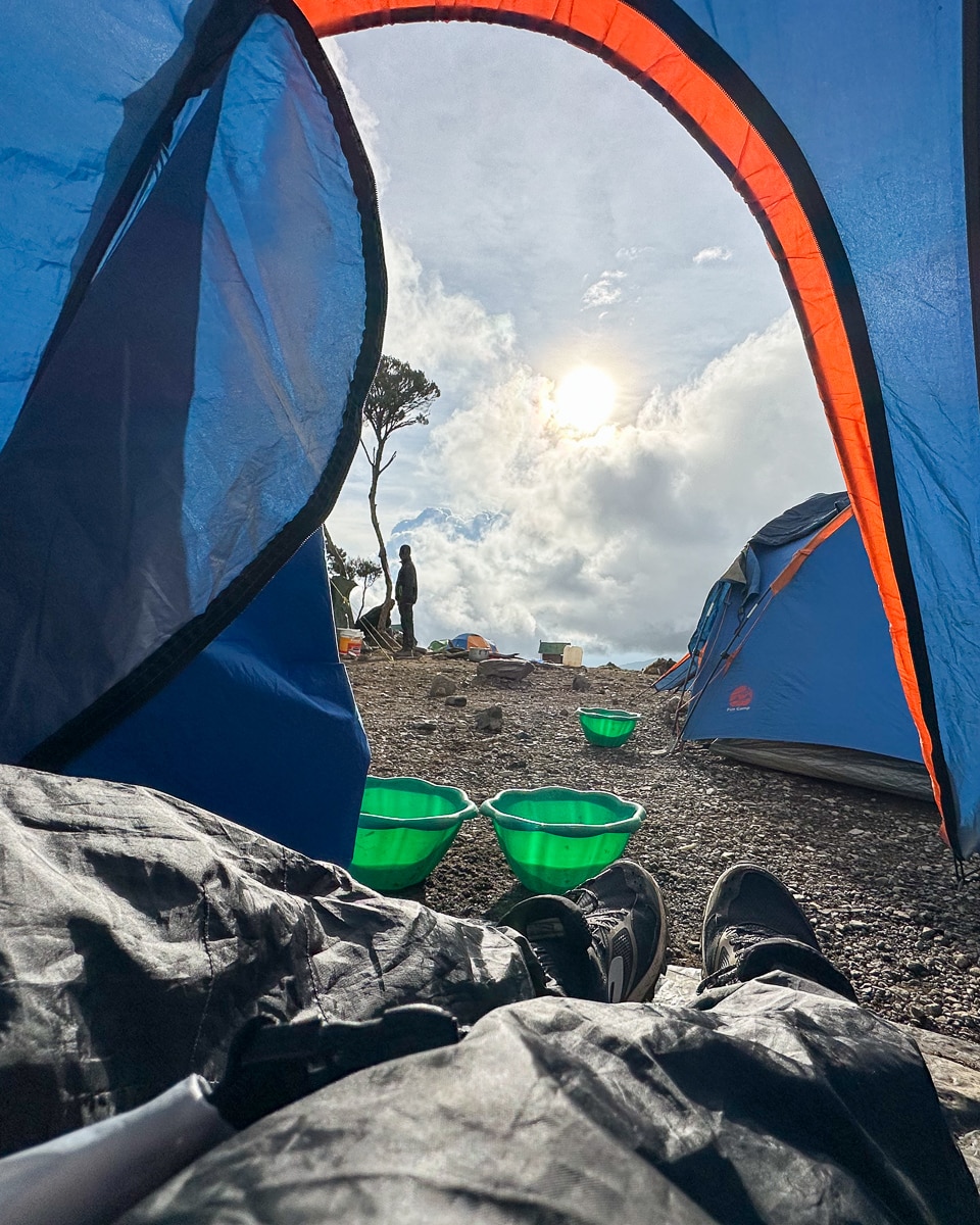 Nach einer erholsamen Nacht klingelte der menschliche Wecker namens „Isaac“ erneut um 6:30 Uhr mit Kaffee und Tee an unserer Zelttür. An diesem Morgen war die Luft derart klar, dass sowohl Mt. Meru als auch der mit jedem Tag näher kommende Kili-Koloss in vollem morgendlichem Sonnenglanz erstrahlen konnten.