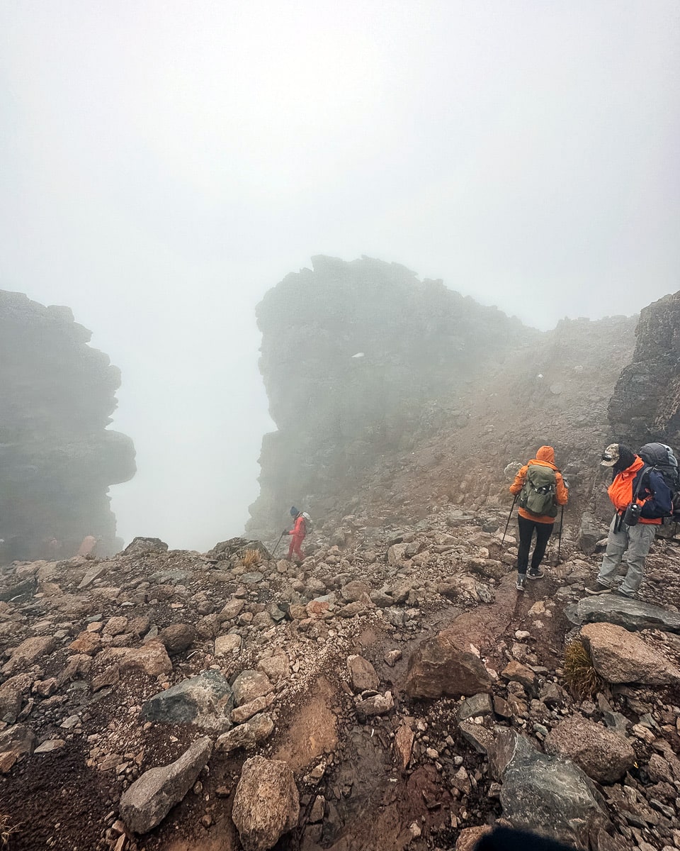Nach einer kurzen Pause für Snacks und Energieriegel setzten wir den Aufstieg fort durch die neblige, immer flacher und trockener anmutende Landschaft.