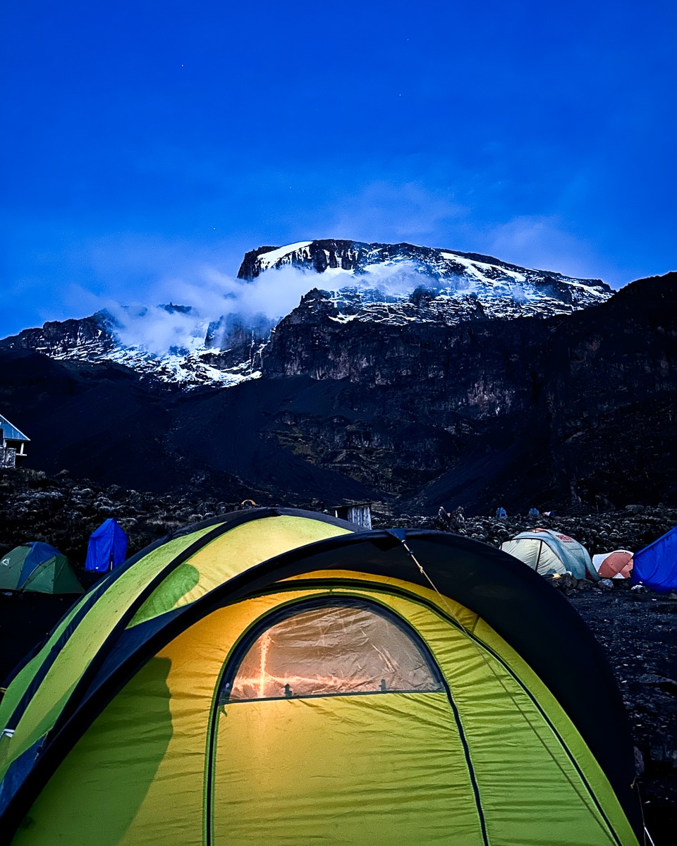 Vom Barranco Camp (3.900 m) geht es zum Karanga Camp, um dort nur die Mittagspause zu verbringen, wo andere eine Nacht verweilen. Danach geht es direkt weiter mit dem Anstieg bis zum Barafu Camp, dem "Base Camp", auf 4.675 m – vor der Gipfelnacht. Das bedeutet, dass du erst gegen 15.30 / 16 Uhr am Barafu Camp ankommst, etwas zu Abend isst und dann versuchst, zu schlafen. Wir hatten dazu rund vier Stunden Zeit, ehe wir um 23 Uhr geweckt wurden. Danach stand ab Mitternacht der Gipfelanstieg und darauffolgende Abstieg an, vor 11 Uhr Vormittag ist man nicht zurück. So müde waren wir schon lange nicht mehr.