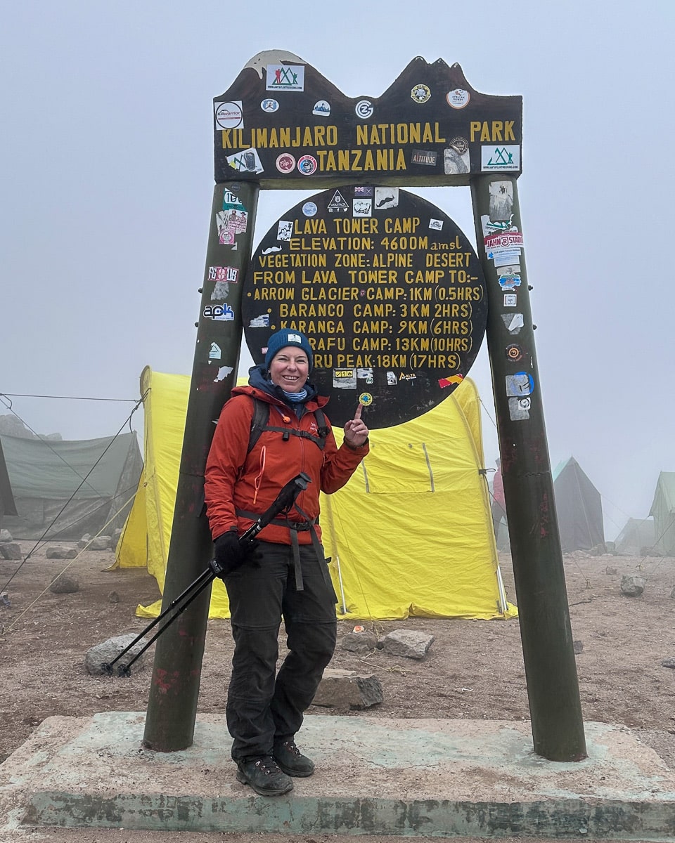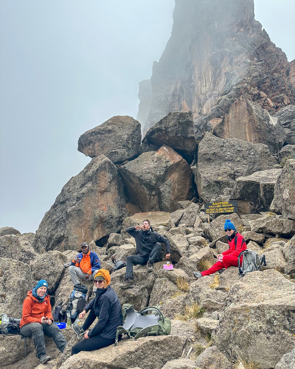 Dennoch schafften alle von uns es um 13 Uhr auf 4.700 Höhenmeter zum Lava Tower Camp. Hier akklimatisierten wir uns beim Verzehr unserer Lunchboxen – Hühnchen, French Toast mit Marmeladenfüllung, Apfel und Saft – bevor wir um 13:40 Uhr zum Abstieg aufbrachen. Wobei hier den ersten der Atem stockte, und das nicht wegen der Höhe.