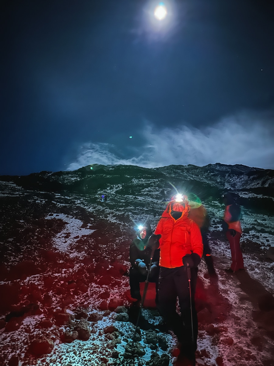 Wie prall gefüllte Lasagnen aus Funktionsunterwäsche, Fleece, Daunen, Regenjacke und Merino-Baumwolle tranken wir Tee und aßen Kekse, bevor es um Punkt Mitternacht – in tiefstem Dunkeln – Richtung Bergspitze ging. Wahlweise mit oder ohne Sturmhaube, Kapuzen, Jackenschichten, dicken Wollmütze, Skihandschuhen und Stirnlampen sahen wir aus wie bunte Astronauten.