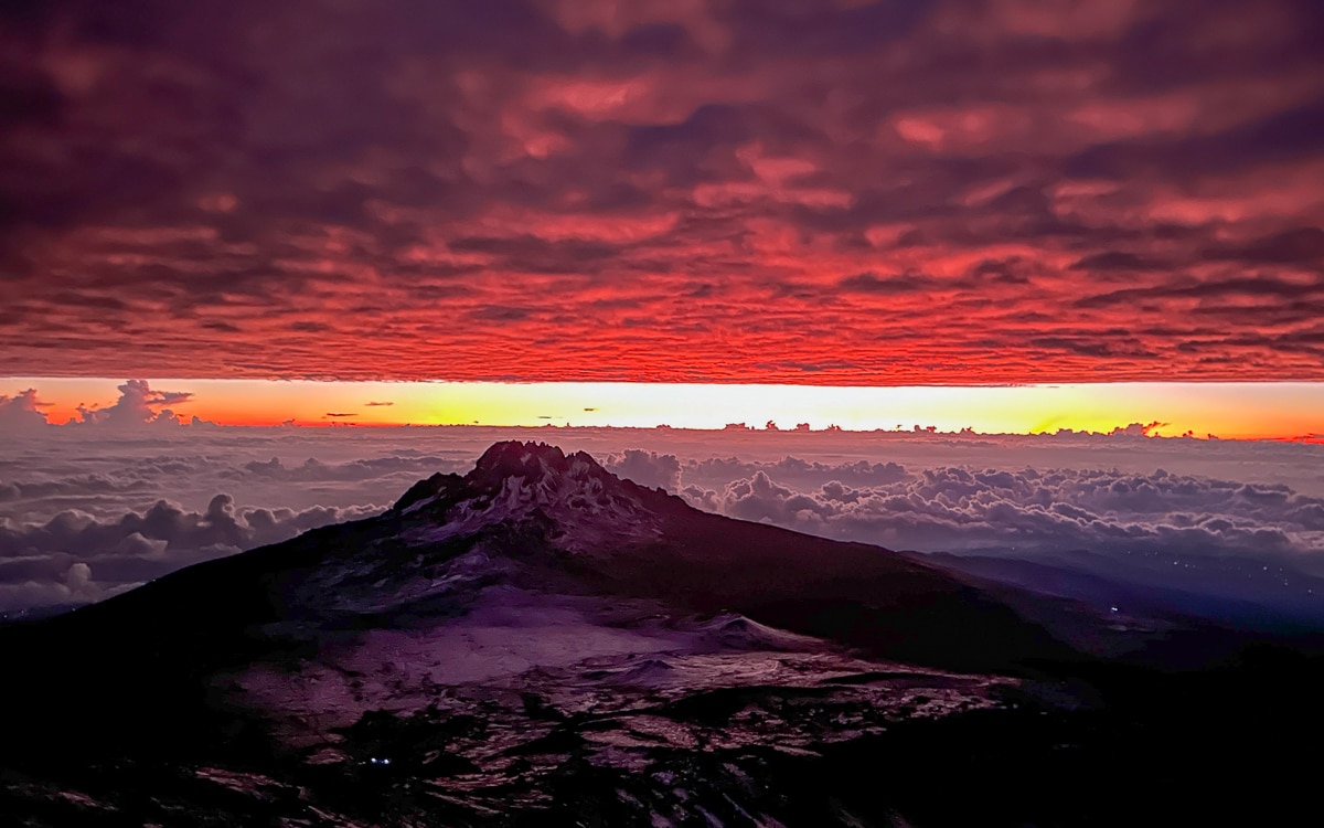 Wir arbeiteten uns durch Schnee und Stein, während sich der Sonnenaufgang wie ein golden glänzender Streifen zwischen die Wolkenschichten schob. Atemberaubend, einzigartig und jede Anstrengung wert!