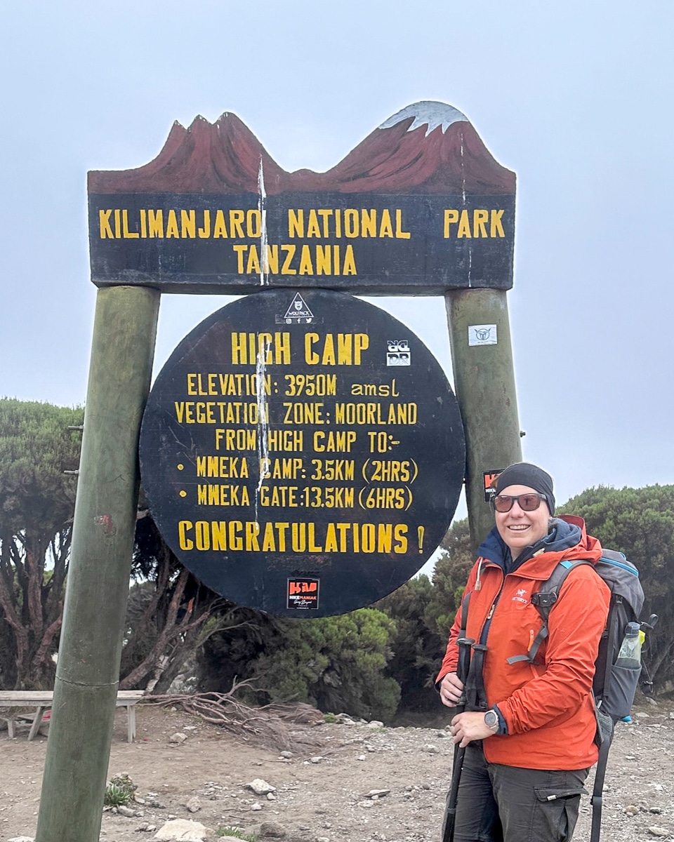 Bei Ankunft im Camp wurden wir erneut besungen und mit Limonade verköstigt, und trotz zweistündigen Mittagsschlafs waren wir müde und kamen beim Packen kaum in die Gänge. Es gab ein kleines Mittagessen, doch einige von uns hatten kaum bis gar keinen Appetit. Außerdem brutzelte uns die Sonne nun ganz ordentlich auf den Helm, als wir zwei Stunden bergab zum auf 3.950 Metern gelegene High Camp schleppten, wo wir die letzte Nacht des Abenteuers bestreiten sollten. In diesem Camp hatte es vor nicht allzu langer Zeit gebrannt, und die schwarzen Stümpfe und Äste, die den Hang prägten, waren tote Zeugen dessen.