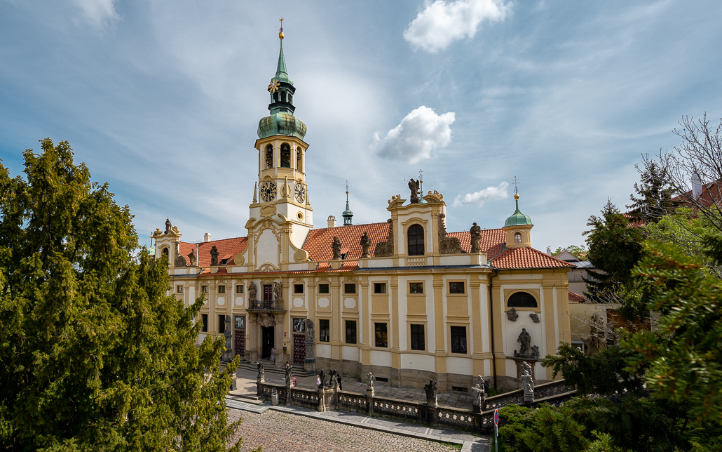 Nur wenige Schritte entfernt von der Prager Burg liegt das Kapuzinerkloster Loreto am Loretoplatz (Loretánské náměstí). Das bewundernswerte, barocke Gebäude ist fast 400 Jahre alt. Ein beliebtes Wahlfahrtgelände mit Heiligen-Haus, der Kirche der Geburt Christi und einem Turm mit einem weltbekannten Glockenspiel.