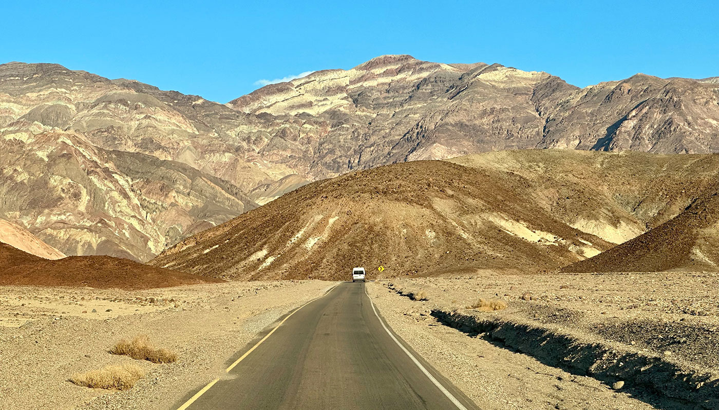 - 15 Kilometer bevor die Badwater Basin Road wieder auf den Highway 190 trifft, kannst du rechts auf den Artist Drive abbiegen und quasi einen kleinen zusätzlichen Scenic Drive unternehmen. Der 14 Kilometer lange Abstecher führt in einem Halbkreis ganz nah an die farbenfrohen Felsen im Nationalpark heran.
