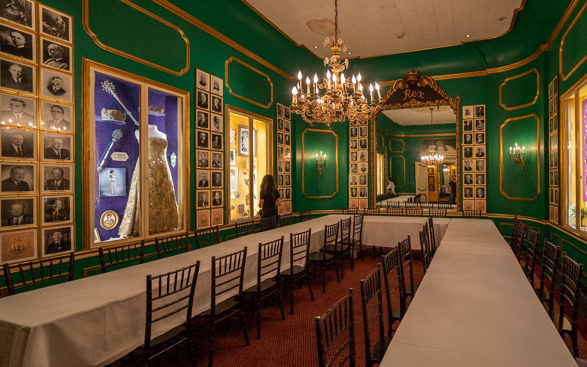 - In Antoine's Restaurant, dem ältesten Restaurant der Stadt gibt es spezielle Mardi Gras Themenräume, der größte ist der Rex-Raum, der frühere Könige und Königinnen ehrt. Der Raum zeigt Fotos aller Karnevalskönige von 1872 bis heute sowie Vitrinen voller Kronen, Zepter und anderer Erinnerungsstücke. Ansonsten speisten hier echte Könige: der Herzog und die Herzogin von Windsor während ihres Besuchs am Mardi Gras im Jahr 1950.