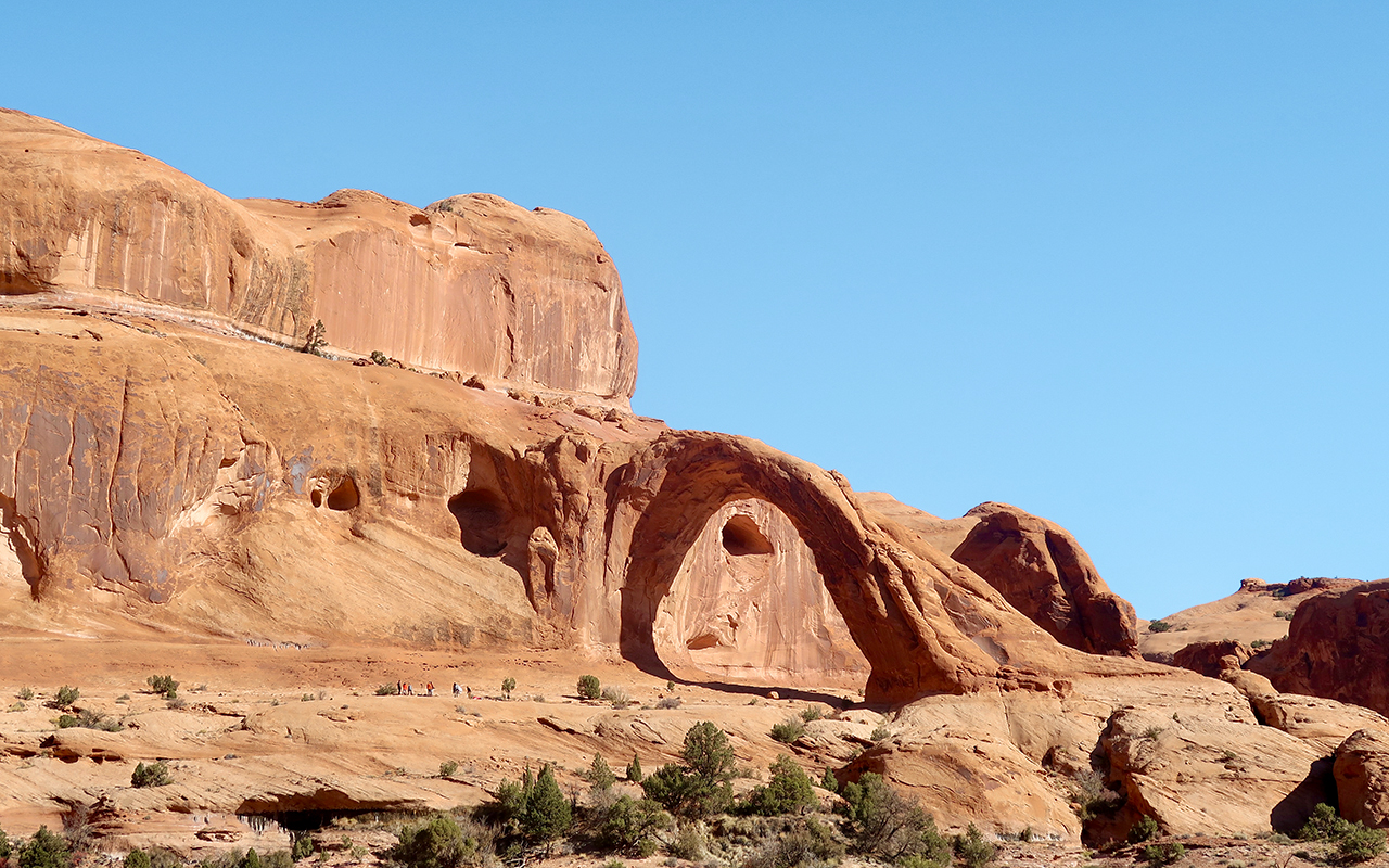 Du hast bisher nicht genug von den Felsbögen und möchtest eine weitere sehen? Dann kann ich dir die Wanderung zur Corona Arch sehr empfehlen! Die einfache Tour zu dem 32 m hohen Bogen ist sehr beliebt (entsprechend am Wochenende leider auch sehr gerne überlaufen), aber die Aussicht wirklich lohnenswert. Unterwegs müssen zwei unkomplizierte Leitern überwunden werden. Die Wanderung ist bei Hundebesitzern sehr beliebt.